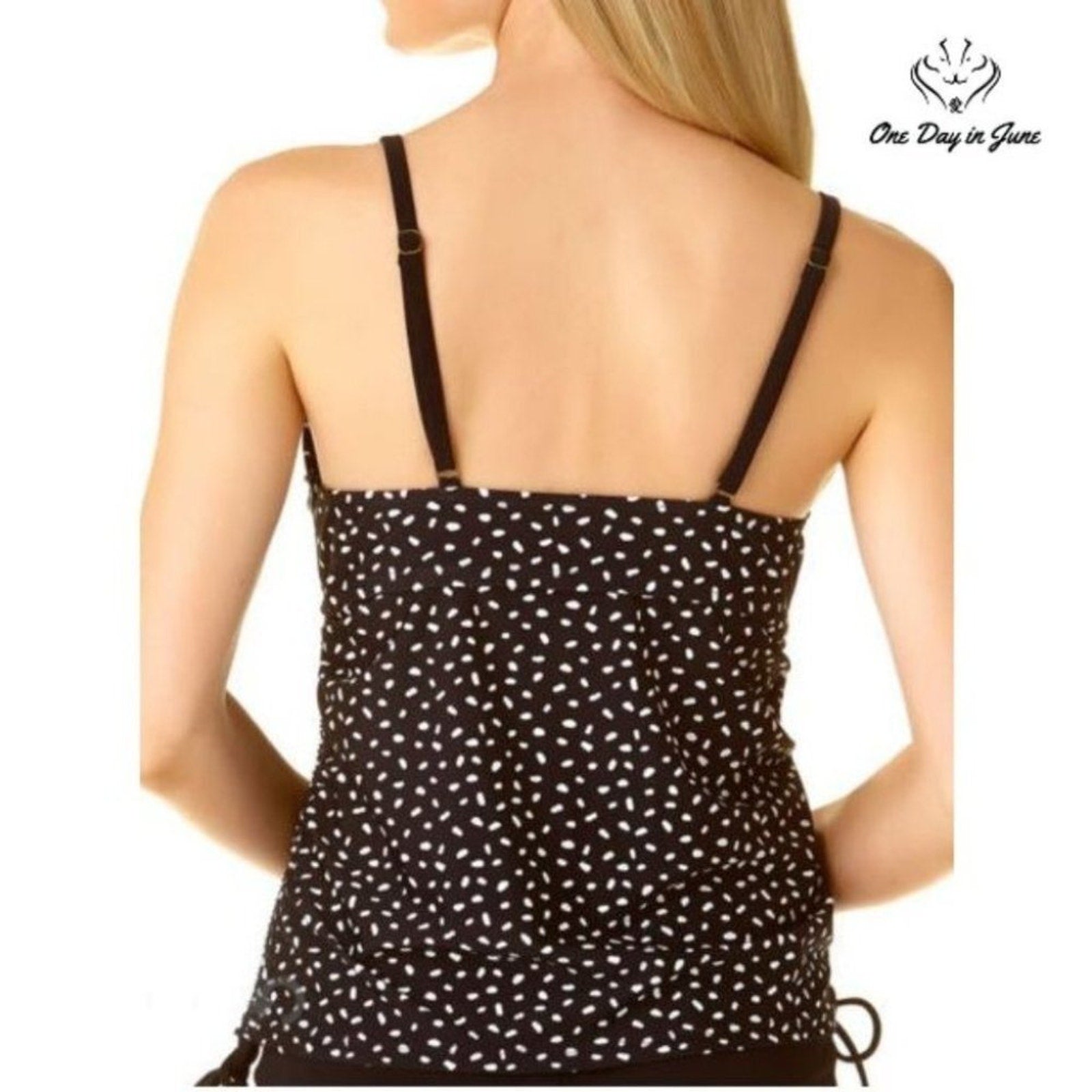 The manic polka dots dance across this pristine tankini top like a fever dream of black and white chaos, swirling in a hypnotic pattern that could mesmerize even the most hardened beach dweller. This a.n.a creation, fresh from some retail purgatory with its tags still clinging desperately to the stretchy polyester-spandex fabric, stands ready to plunge into whatever savage poolside adventure awaits its new owner.
