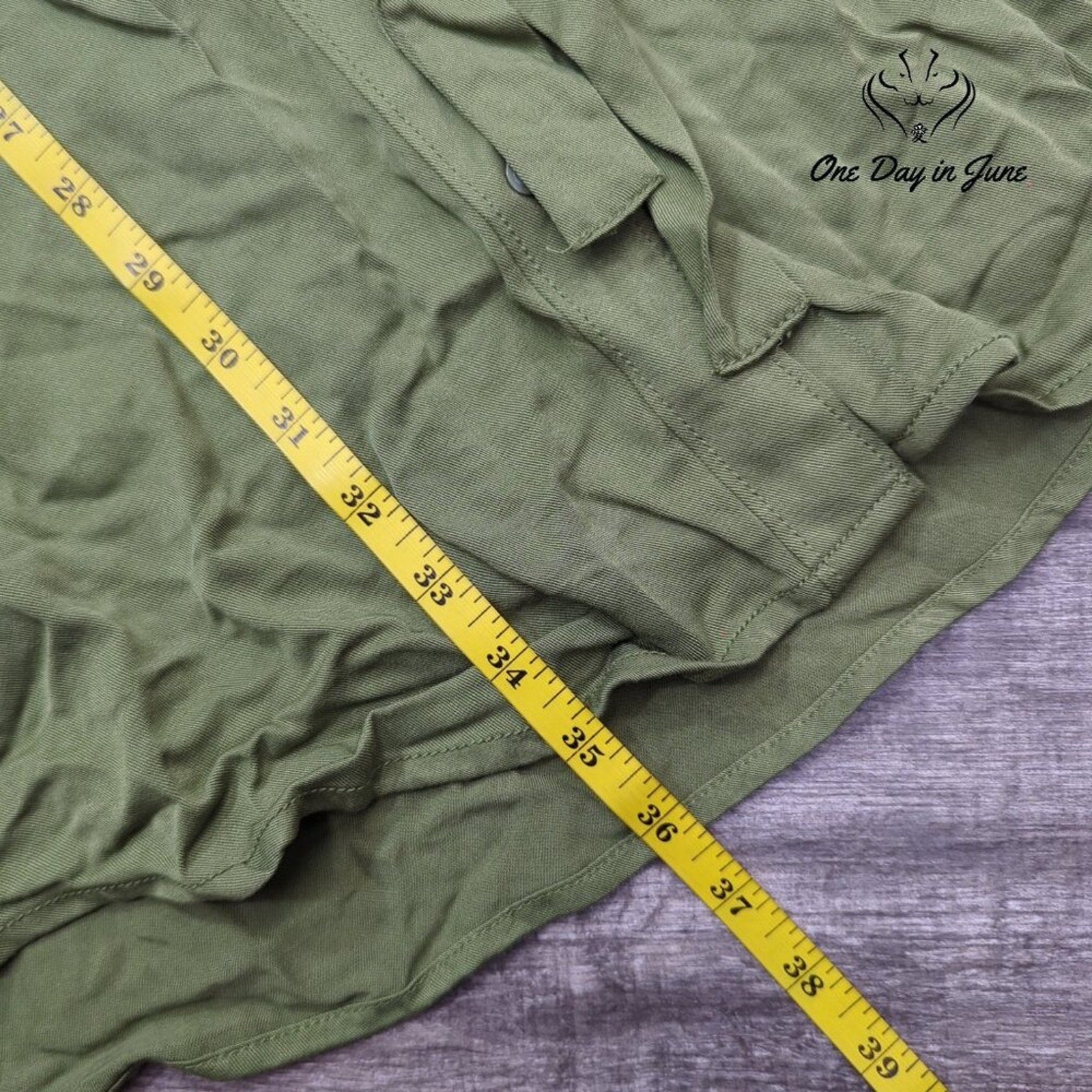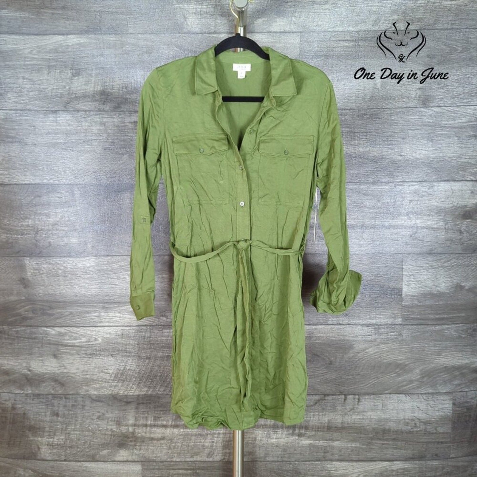 A mini dress so fine in a shade that's serene, with buttons and long sleeves, it's a radiant green. New tags still attached, this rayon delight will make any wardrobe shine with pure, stylish light!
