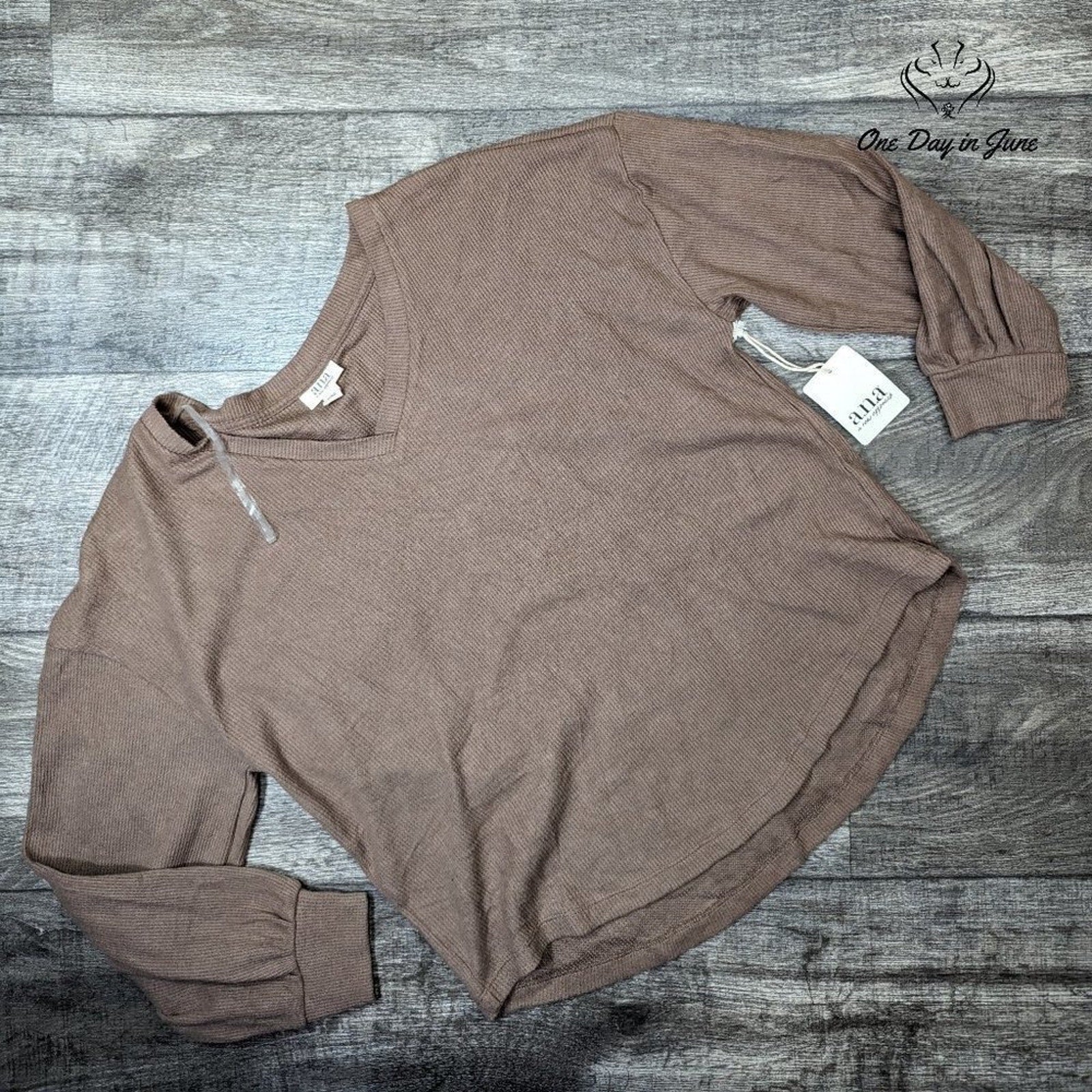 This A.n.a V Neck Top, in a rich hue of brown, is new, untouched, still carrying its tags. Fashioned in a blend of cotton, polyester, and spandex, its long sleeves and ribbed texture promise both comfort and style. The simplicity of its design holds an unspoken truth - that less is indeed more.