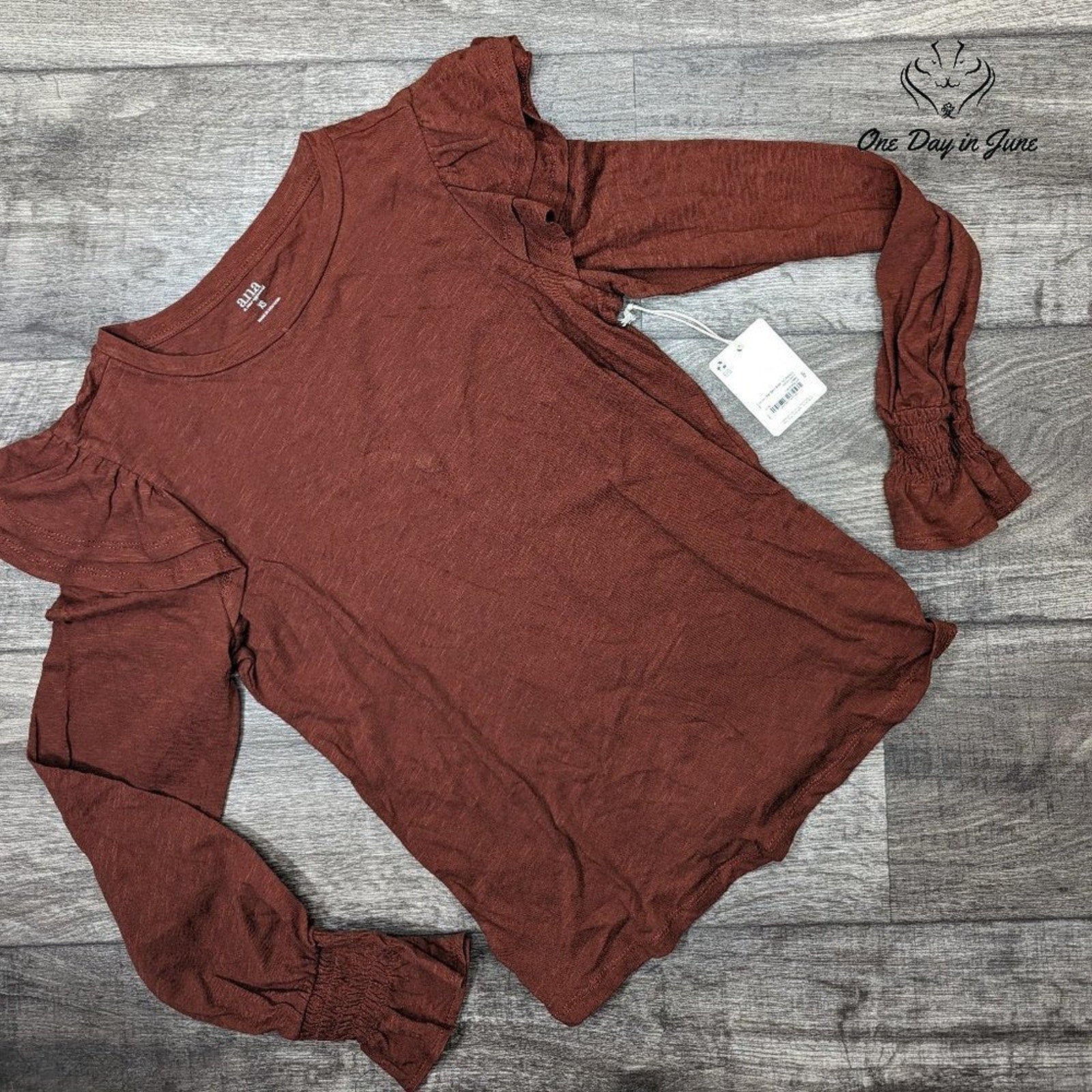 The ruffle shoulders on this brown beauty explode like architectural madness across the cotton fabric—a twisted testament to whoever designed this magnificent beast at A.n.a. Fresh from the factory with tags still attached, this long-sleeved wonder screams feminine rebellion in its purest form, the kind of garment that makes you want to grab life by the throat and shake it until something interesting happens.