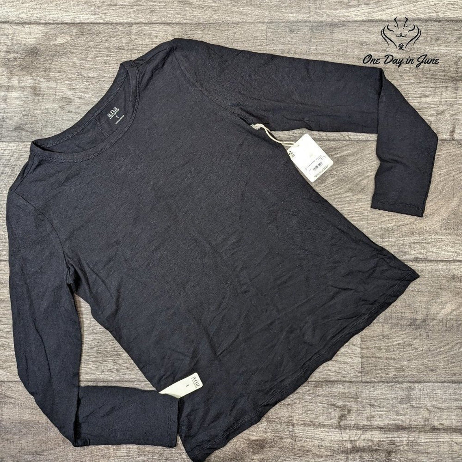 "An A.n.a tee, sleek as the night, perfect for a lady who wants comfort done right. Made with a mix of cotton, modal, and a dash of spandex might, this black long-sleeve top is a true delight!"
