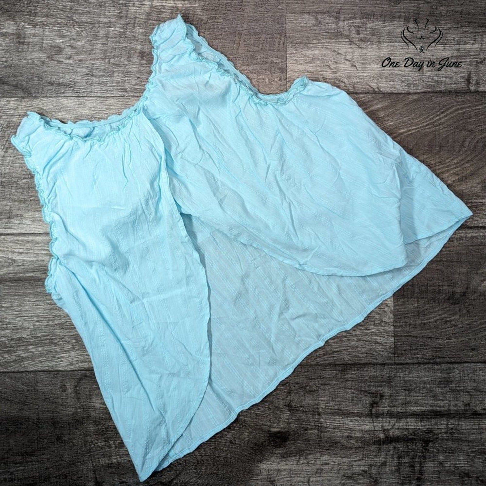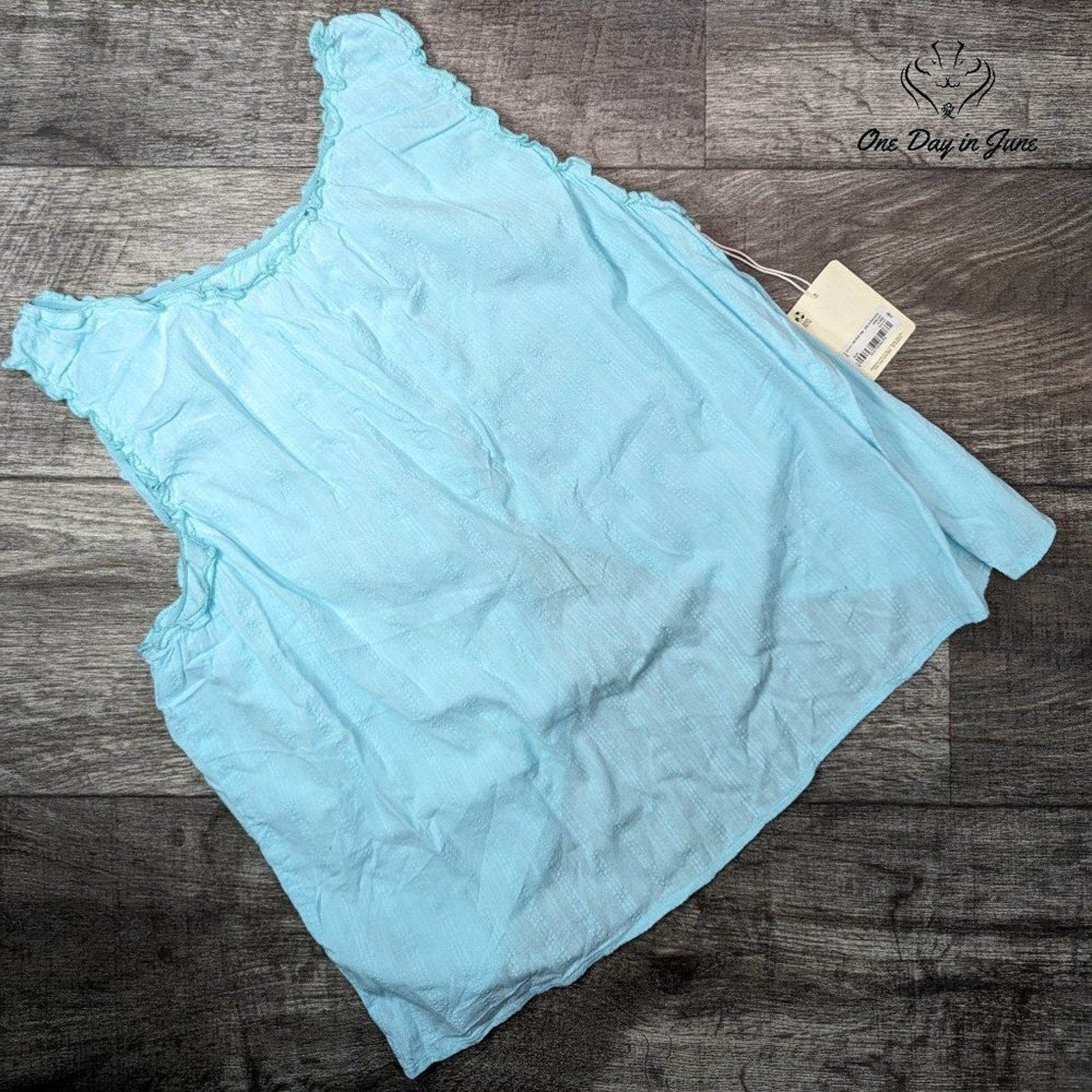 A most charming tank top from a.n.a, fashioned in a pleasing blue hue and adorned with delicate ruffle edging that speaks to the feminine sensibility. The cotton construction ensures comfort befitting a lady's daily pursuits, whether attending to household matters or taking a turn about the shops. New with tags, this garment awaits its destined wearer with all the promise of unworn finery.