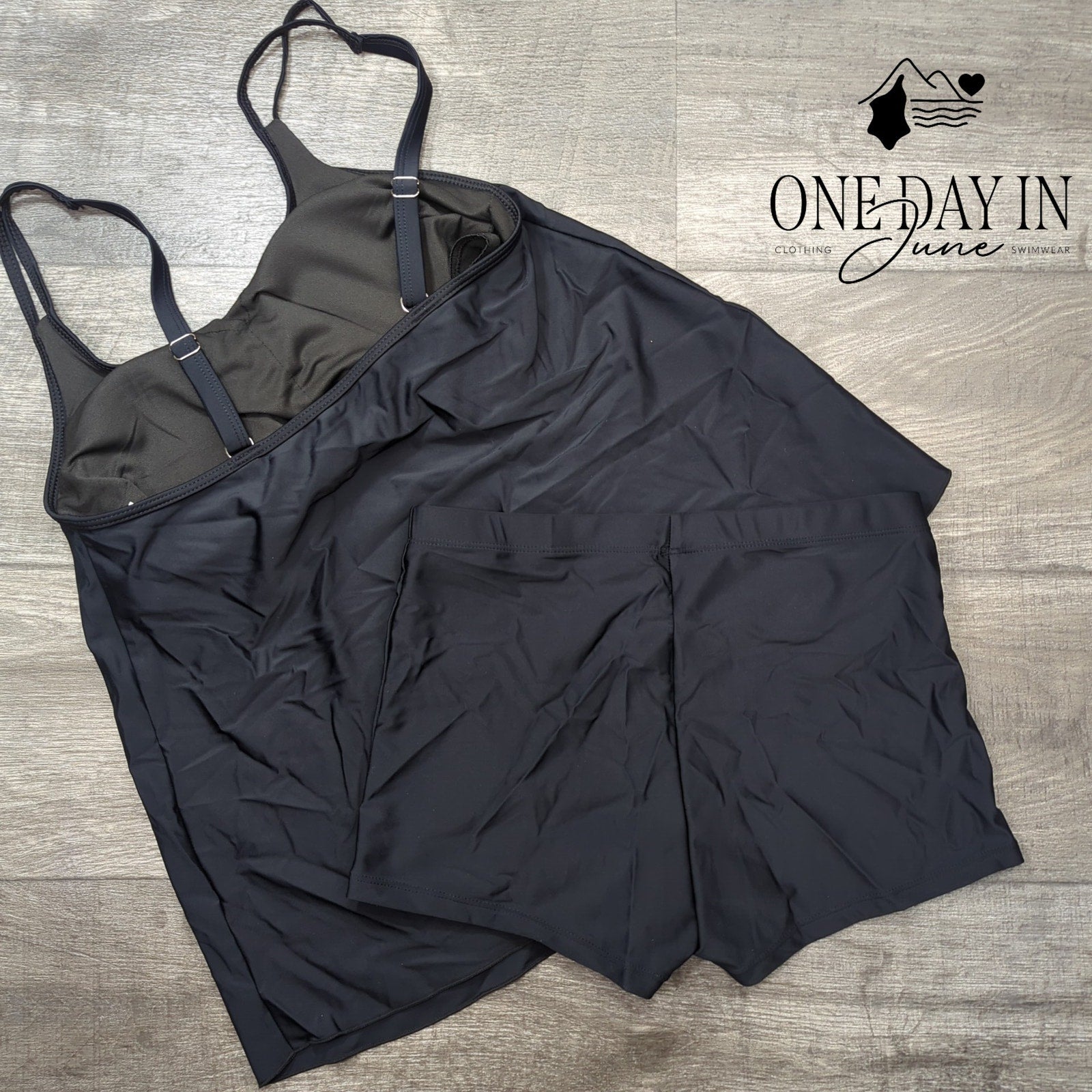 A most becoming boyshort tankini in the deepest shade of black, offering both modesty and elegance for the discerning lady's aquatic pursuits. The thoughtful design provides comfortable coverage whilst maintaining a flattering silhouette that would not be amiss at the finest seaside establishments. Crafted from a delightful blend of polyester and spandex, this charming piece promises both durability and the most agreeable fit for one's summer diversions.