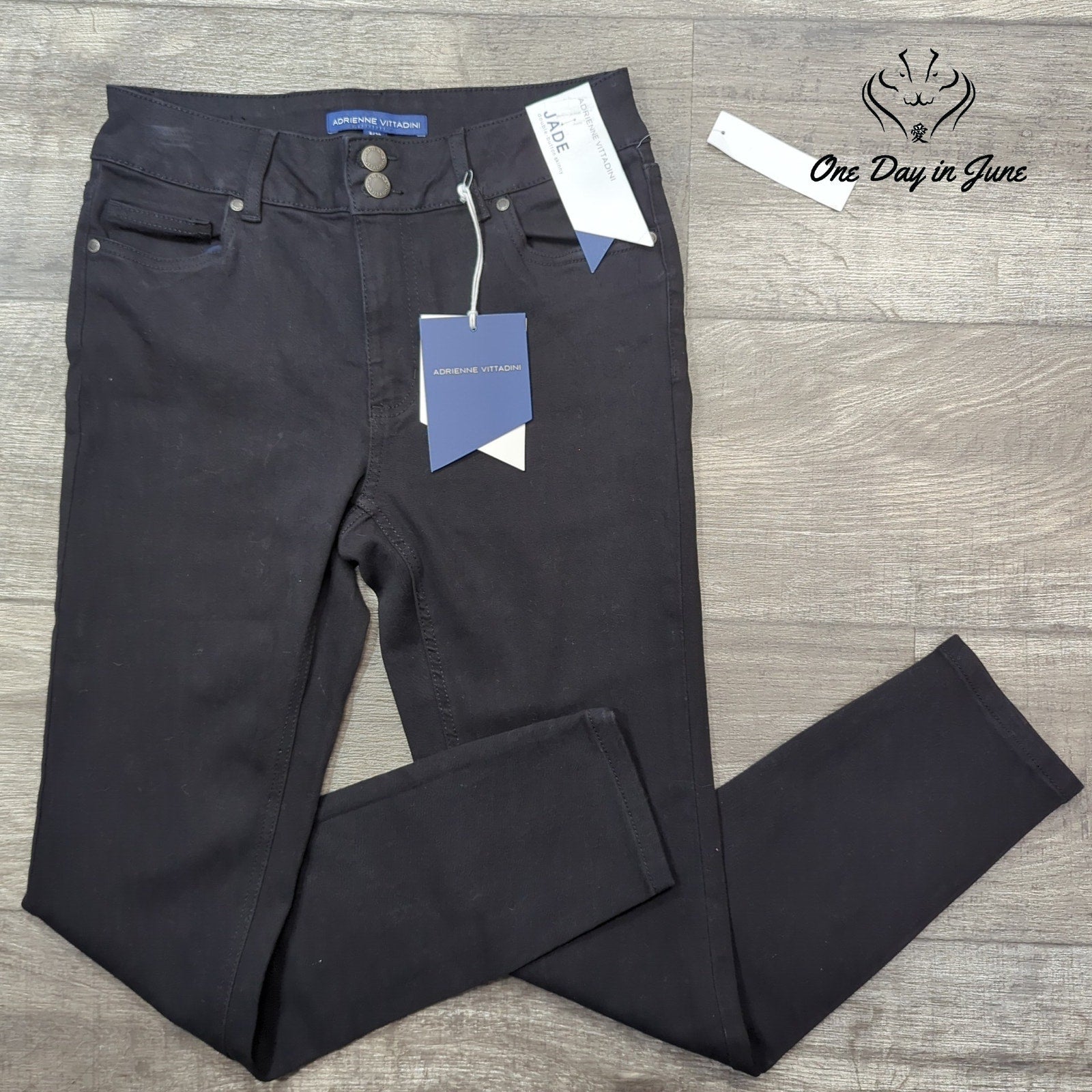 These exquisite black skinny jeans from the esteemed House of Adrienne Vittadini are a most becoming addition to any lady's wardrobe. The double-button closure lends a touch of distinction, while the fabric blend offers both comfort and elegance, ensuring one maintains a fashionable silhouette throughout even the most demanding of social engagements.