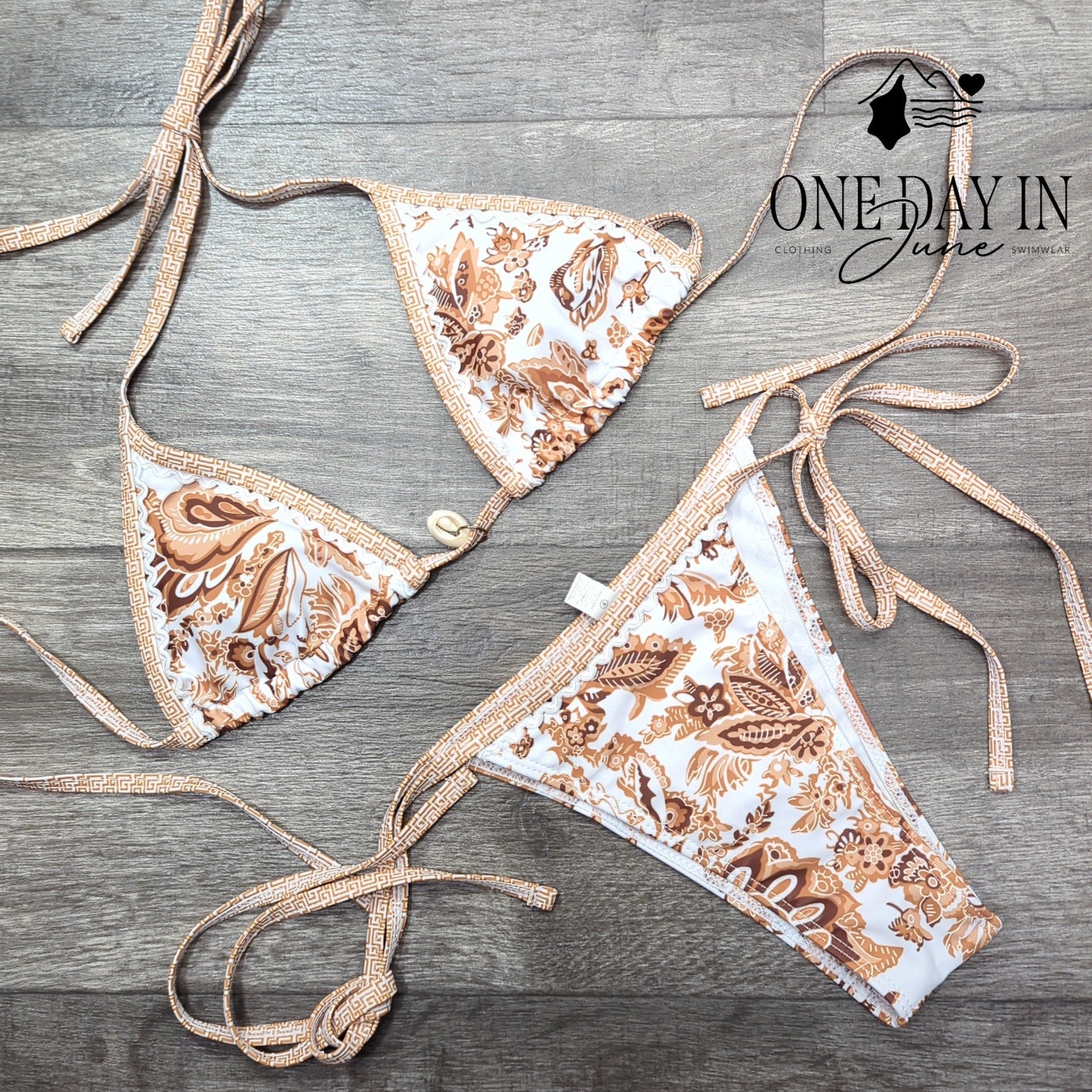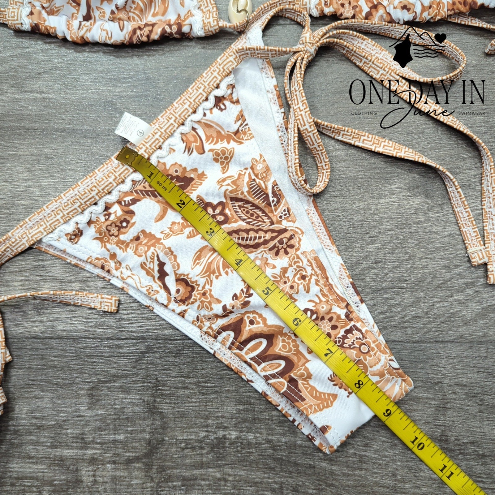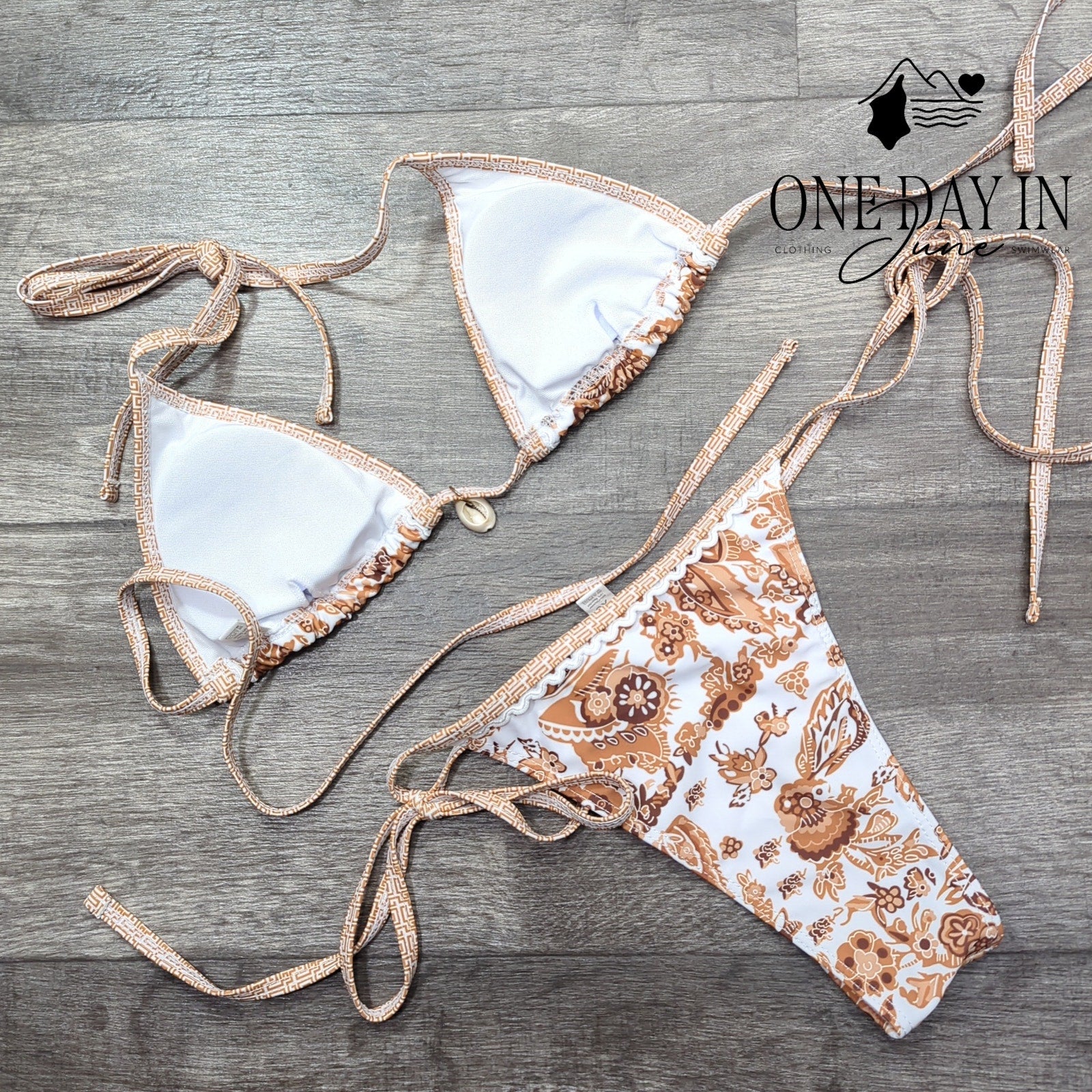 This brown bikini brings beachy bliss with ties that twist and adjust to fit, making waves wherever you sit! With triangle tops and side-tie style, this swimsuit's sure to make you smile with stretchy fabric that moves and grooves through every splash and sunny cruise!