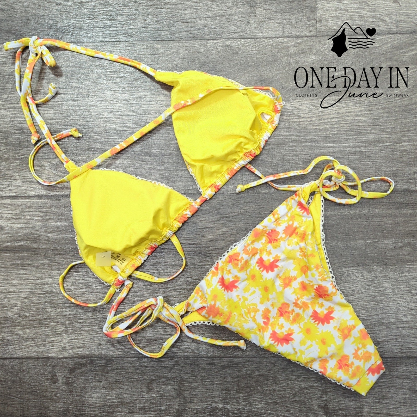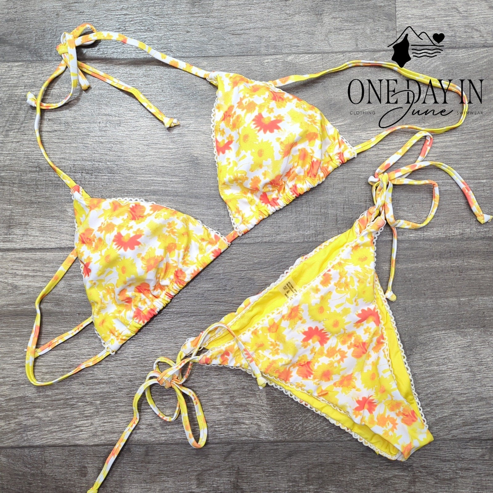 This sunny yellow swimsuit is quite a delight, with triangles that tie and fit just right! The halter top adjusts with ease, while the tie-side bottoms dance in the breeze!