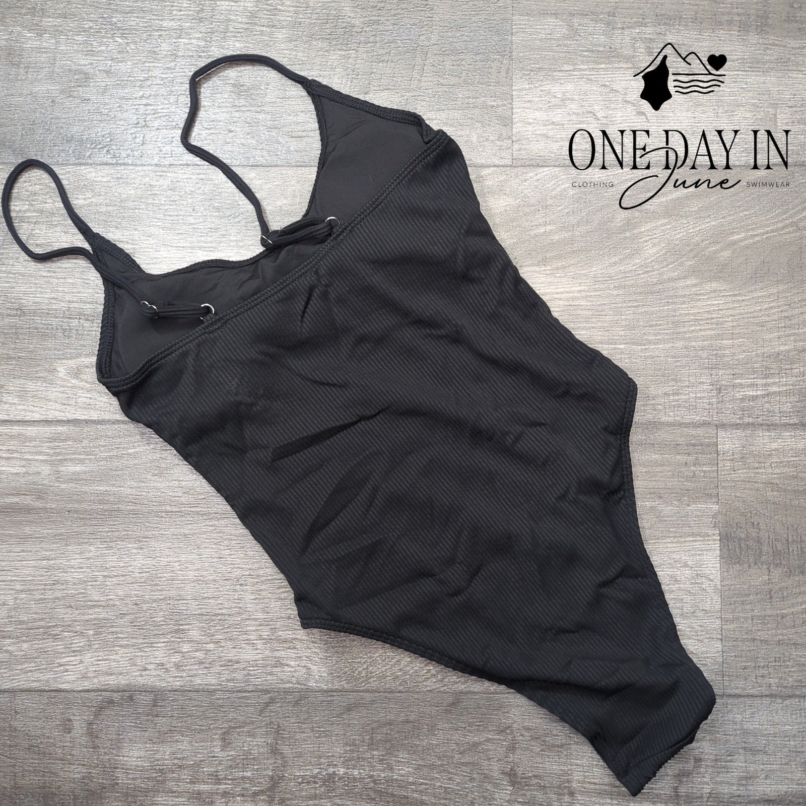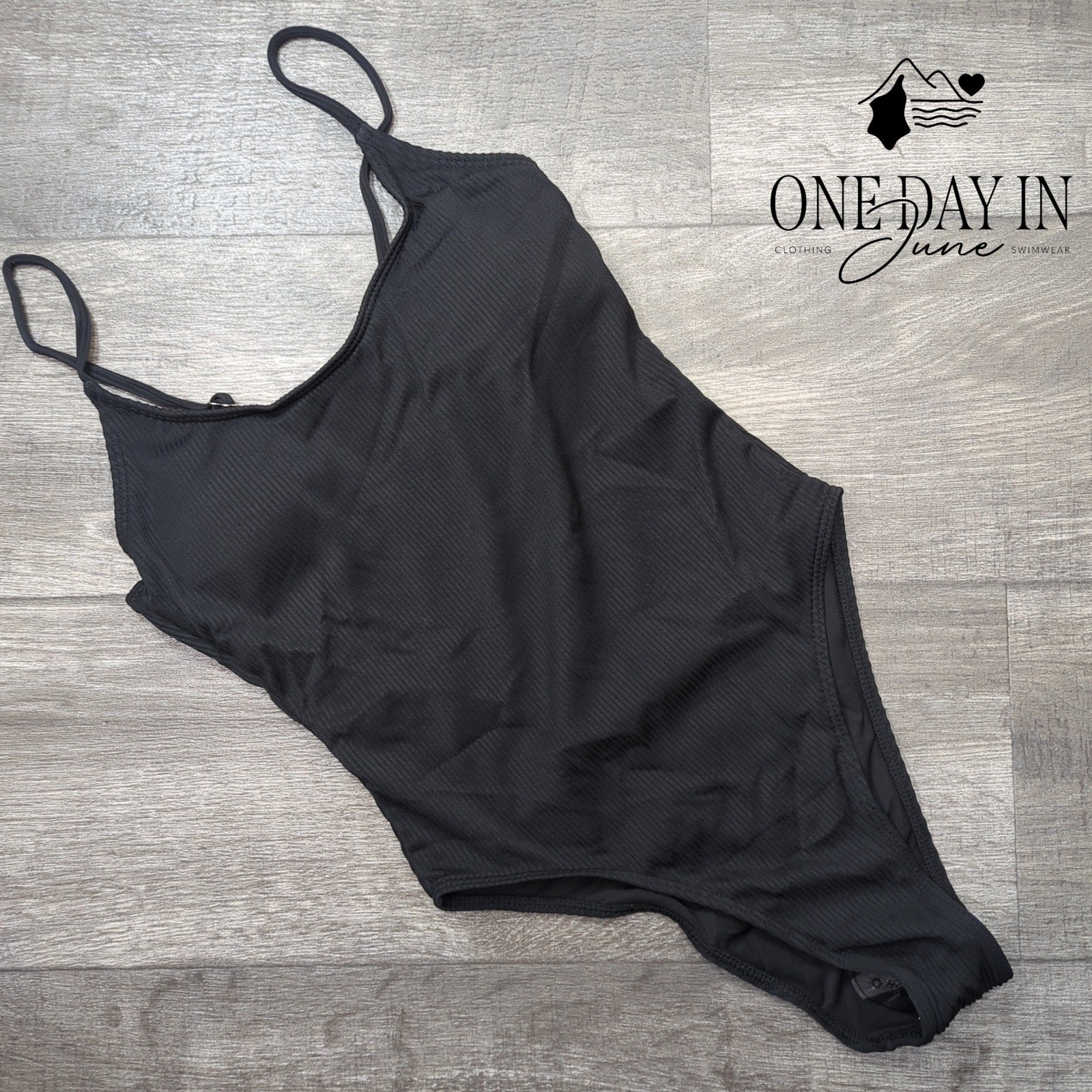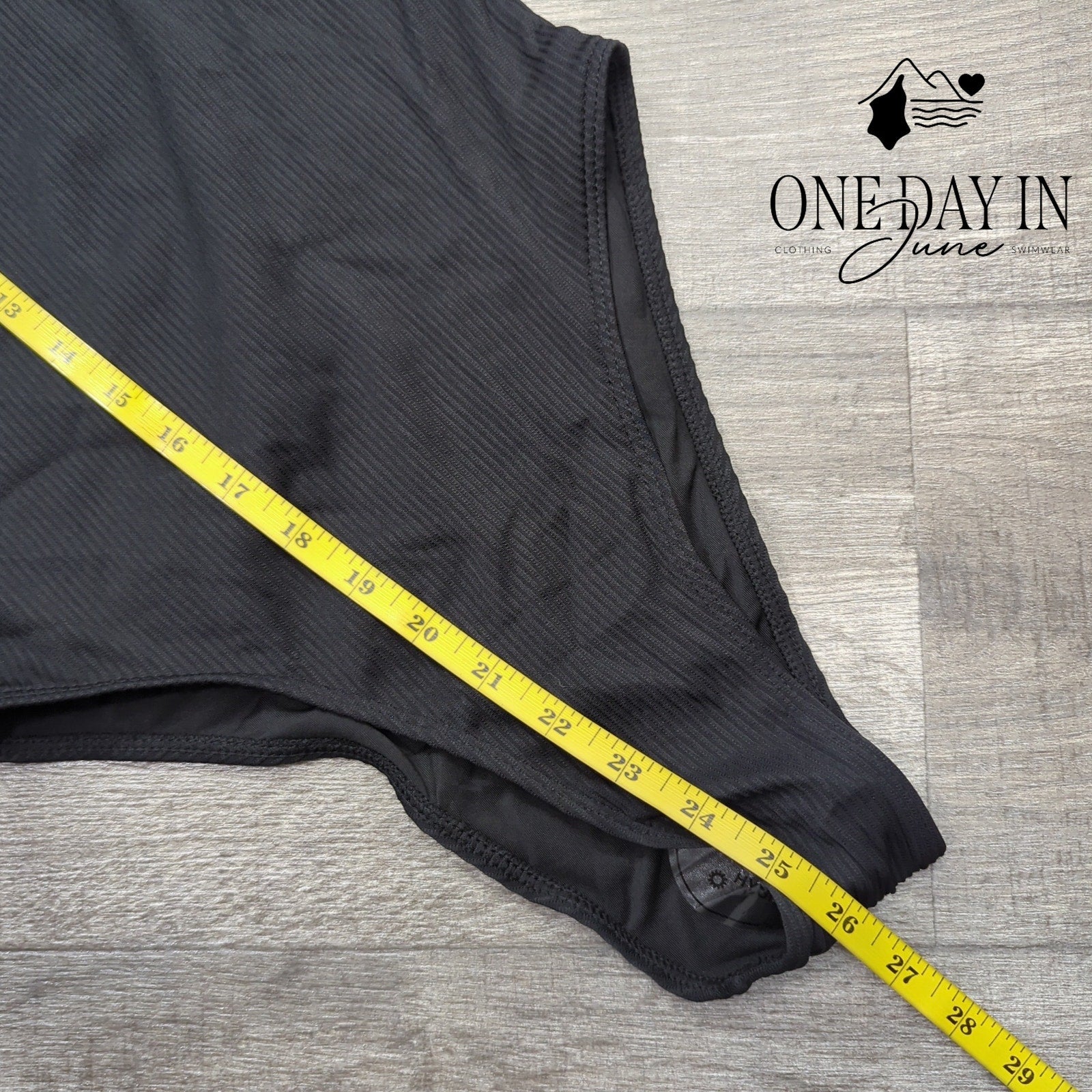 This cheeky black beauty with ribs so neat, will make your beach day oh-so-sweet! A high-cut wonder that's sleek and new, perfect for splashing and swimming too!