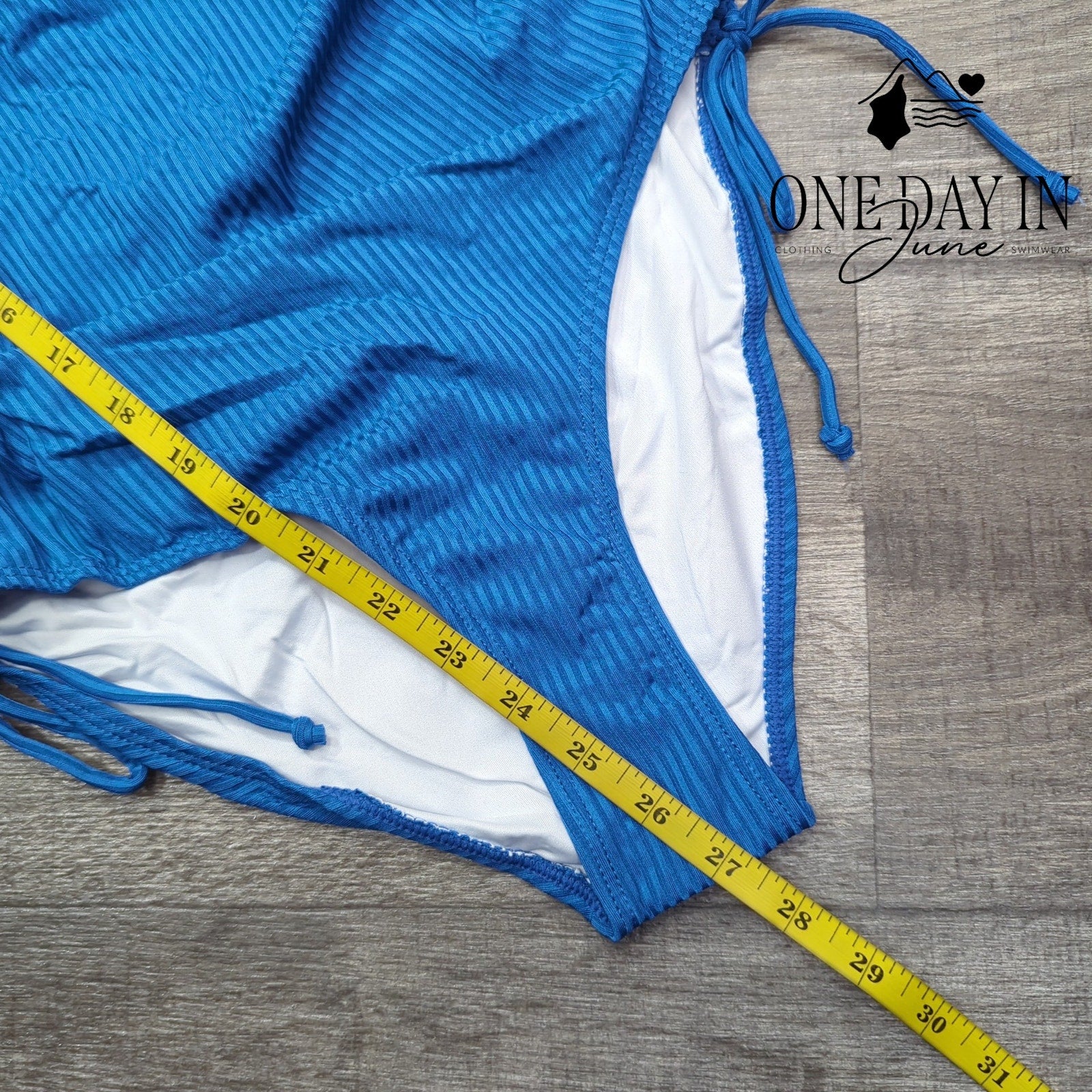 This azure one-piece captures the essence of summer sophistication with its elegantly ribbed silhouette that flatters every curve. Crafted from a luxurious blend of polyester and spandex, it promises both comfort and timeless style for the modern woman. A pristine piece that whispers of poolside glamour and endless summer afternoons.