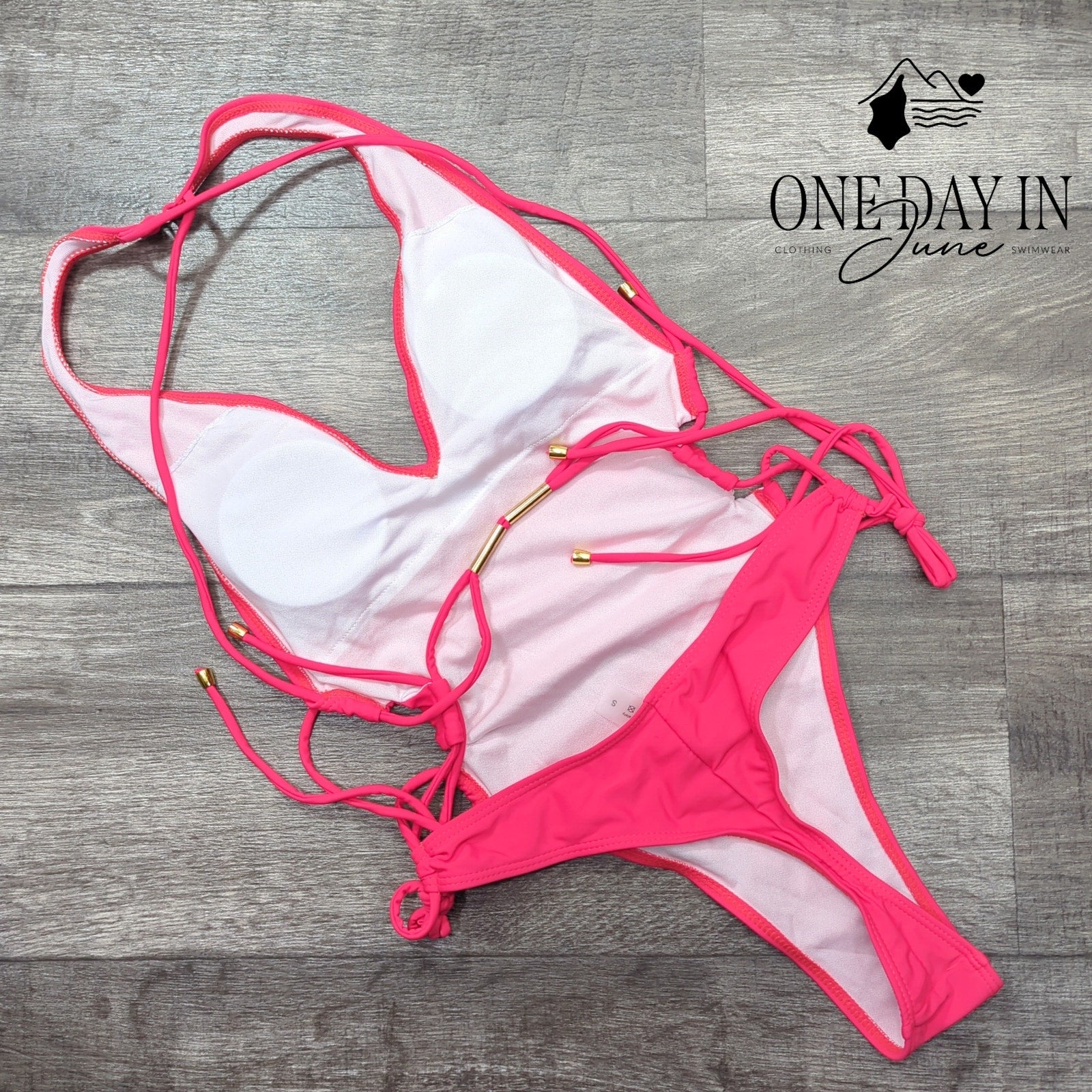 Oh my stars, what a suit so fine, with strappy back details that truly shine! This red one-piece with cut-out flair will make you the belle of the beach affair!