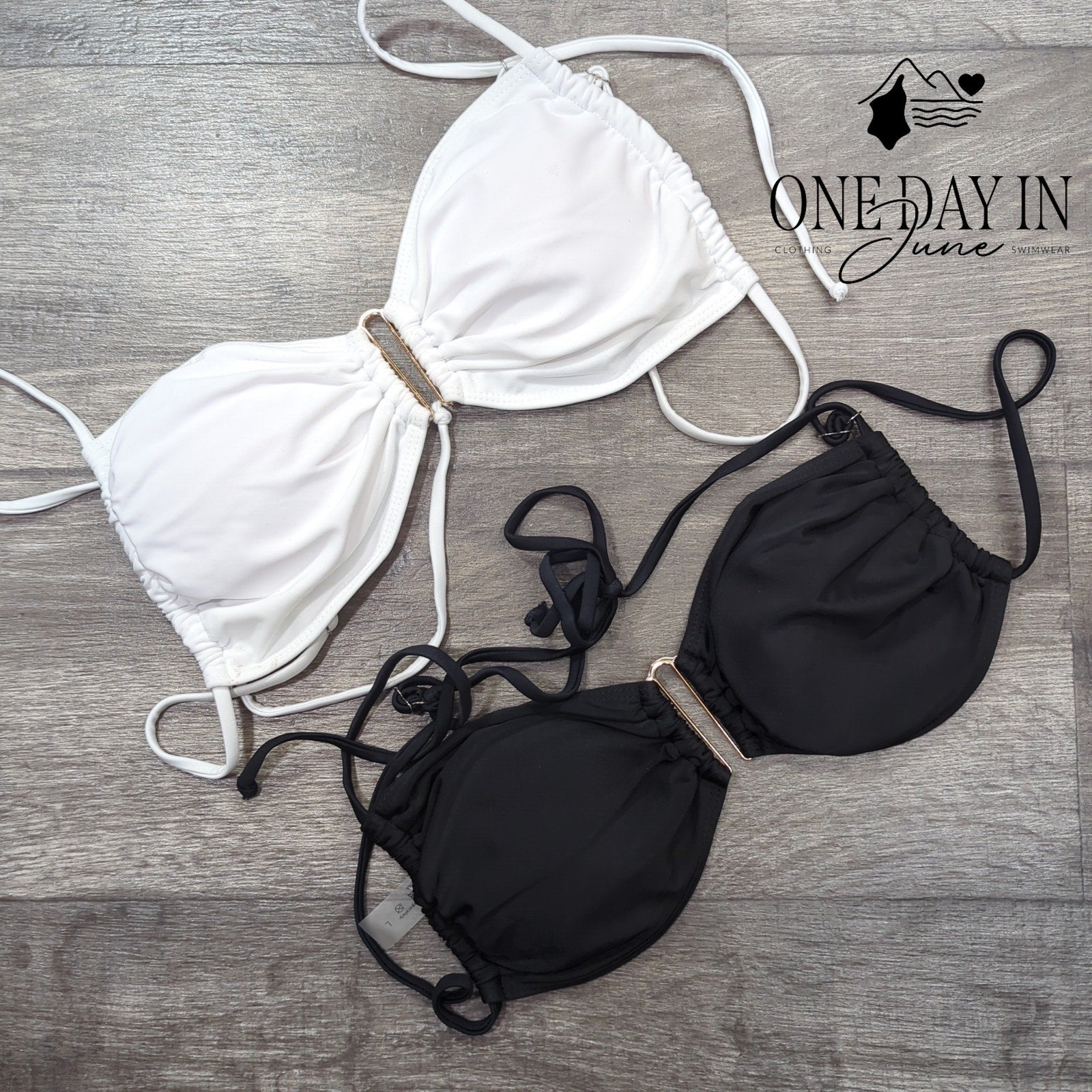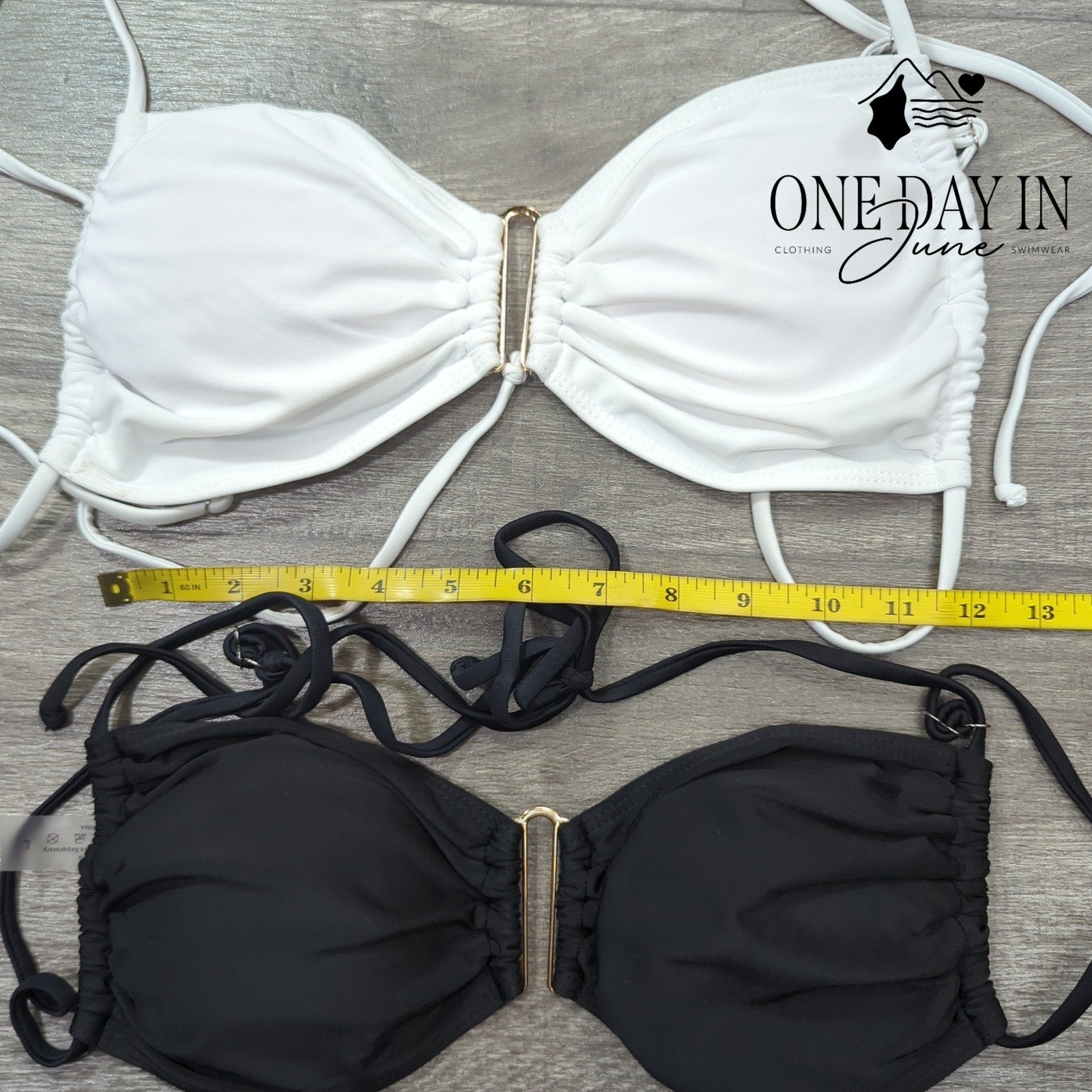 Oh my stars, what a sight to behold - two bikini tops in black and white so bold! With ties that loop and ties that bind, these stretchy tops will blow your mind!