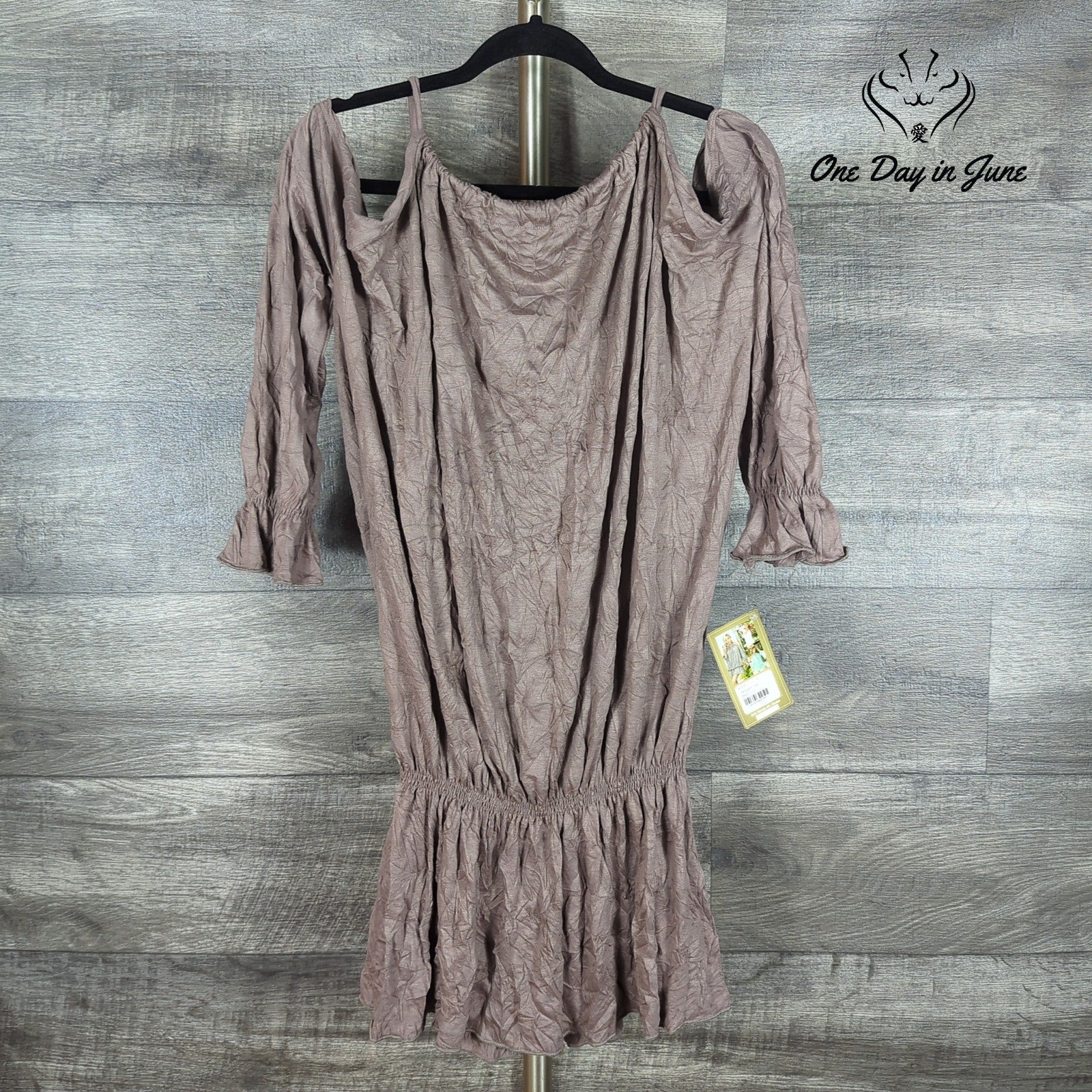 A most becoming desert tan dress of superior quality, crafted from a delightfully soft and stretchy viscose blend that drapes elegantly upon one's figure. This unworn garment, still bearing its original tokens of purchase, promises to bestow upon its wearer a most fashionable appearance suitable for any afternoon engagement or social calling.