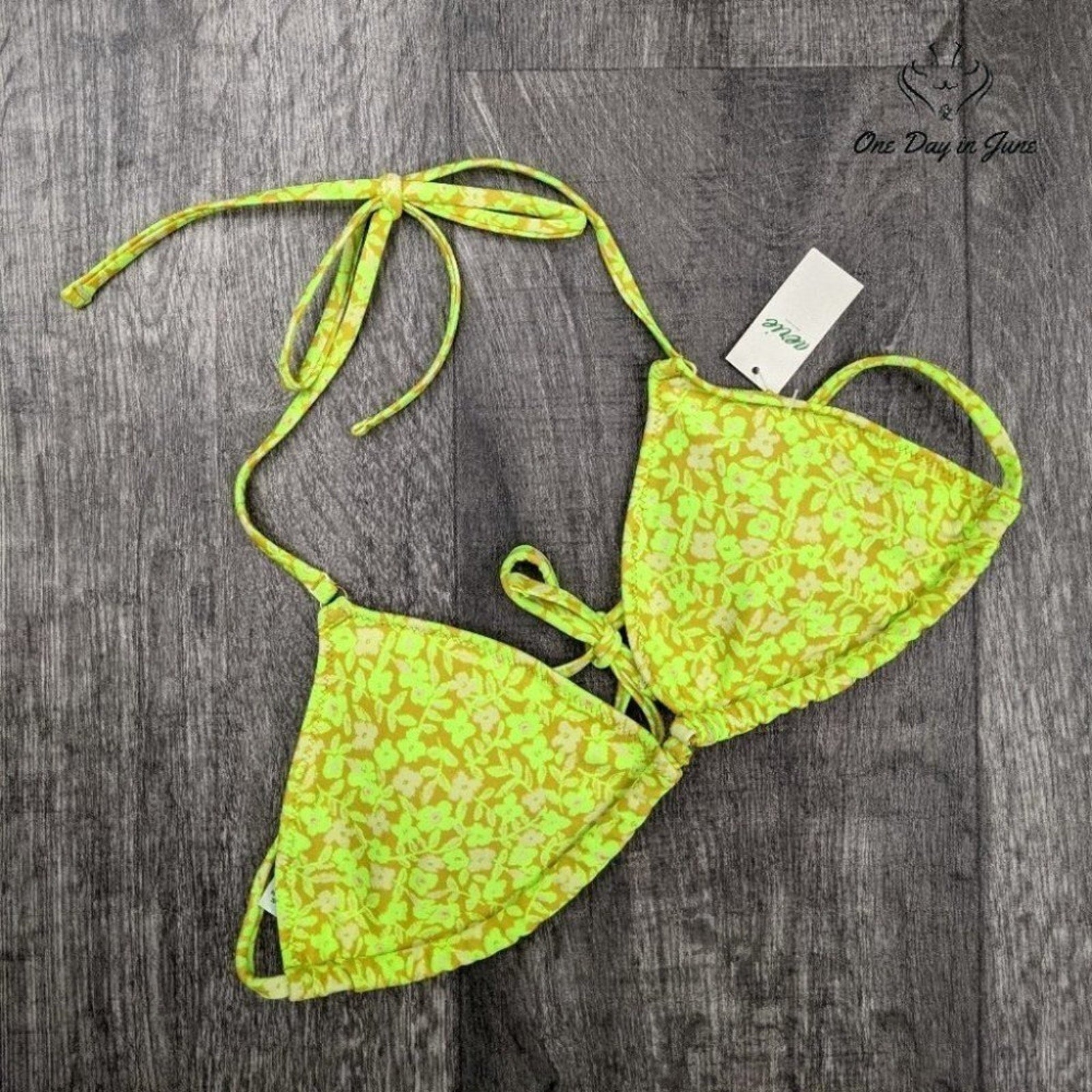 Luminous as summer sunlight, this yellow Aerie triangle bikini top beckons with promises of endless beach days and poolside glamour. Crafted from stretchy, quick-drying fabric, it embodies modern comfort while maintaining that timeless charm that sets hearts aflutter.