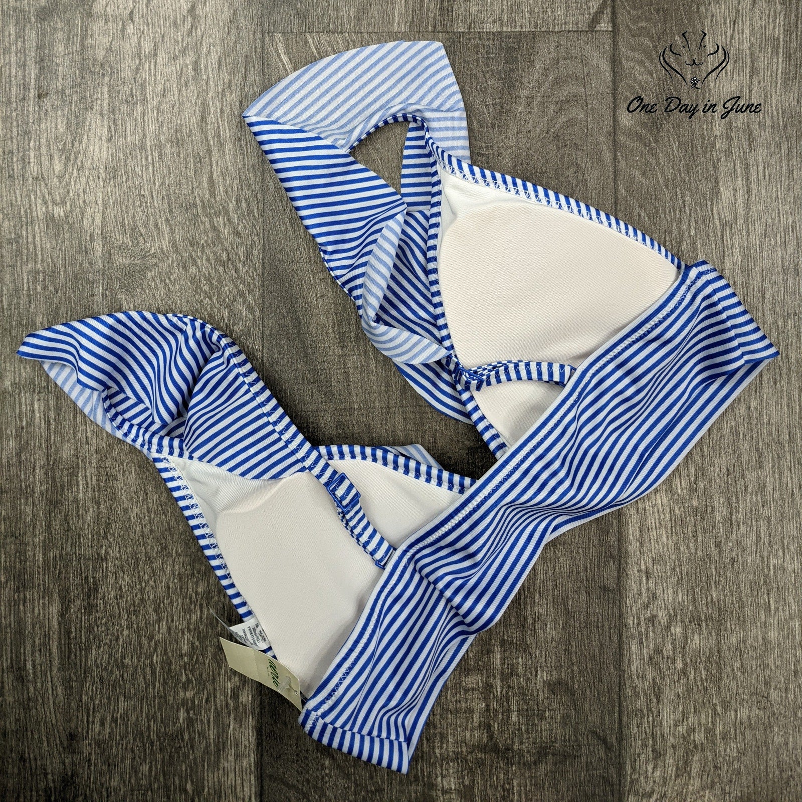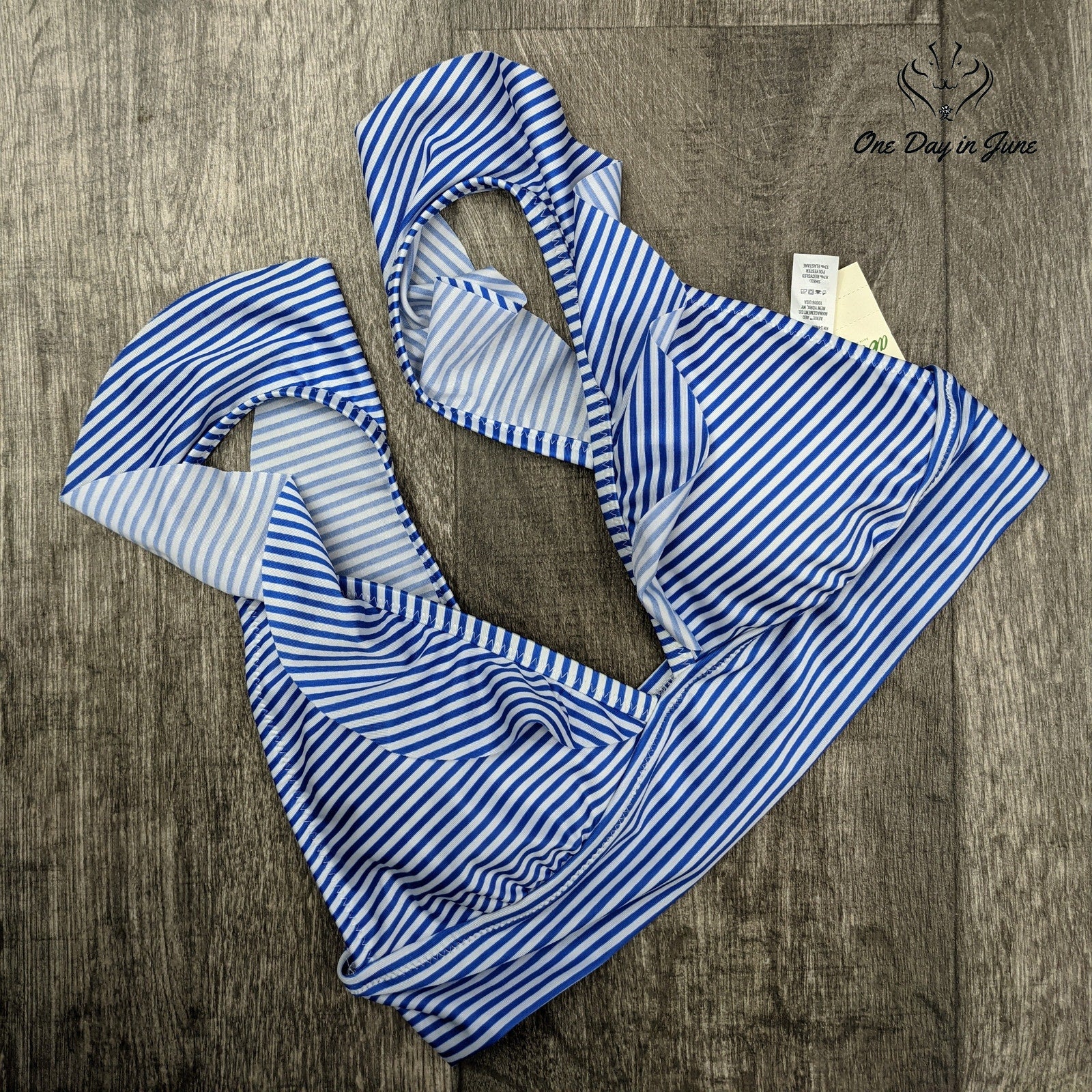 The blue triangle bikini top emerges like a fever dream of summer liberation, crafted from that smooth polyester-spandex blend that moves with your body like liquid confidence across sun-baked beaches. This Aerie masterpiece arrives fresh from the retail wasteland with tags still attached, a pristine artifact of poolside rebellion waiting to unleash its geometric power upon unsuspecting shorelines. The triangle design cuts through convention like a sharp blade through the mundane fabric of everyday existence, promising transformation for those brave enough to embrace its aquatic calling.