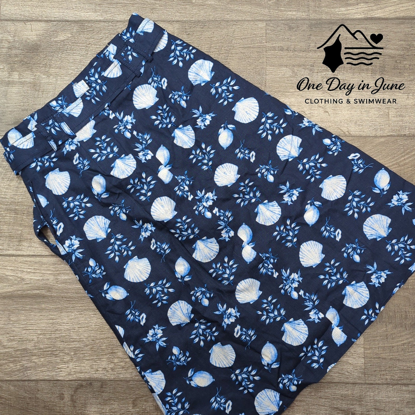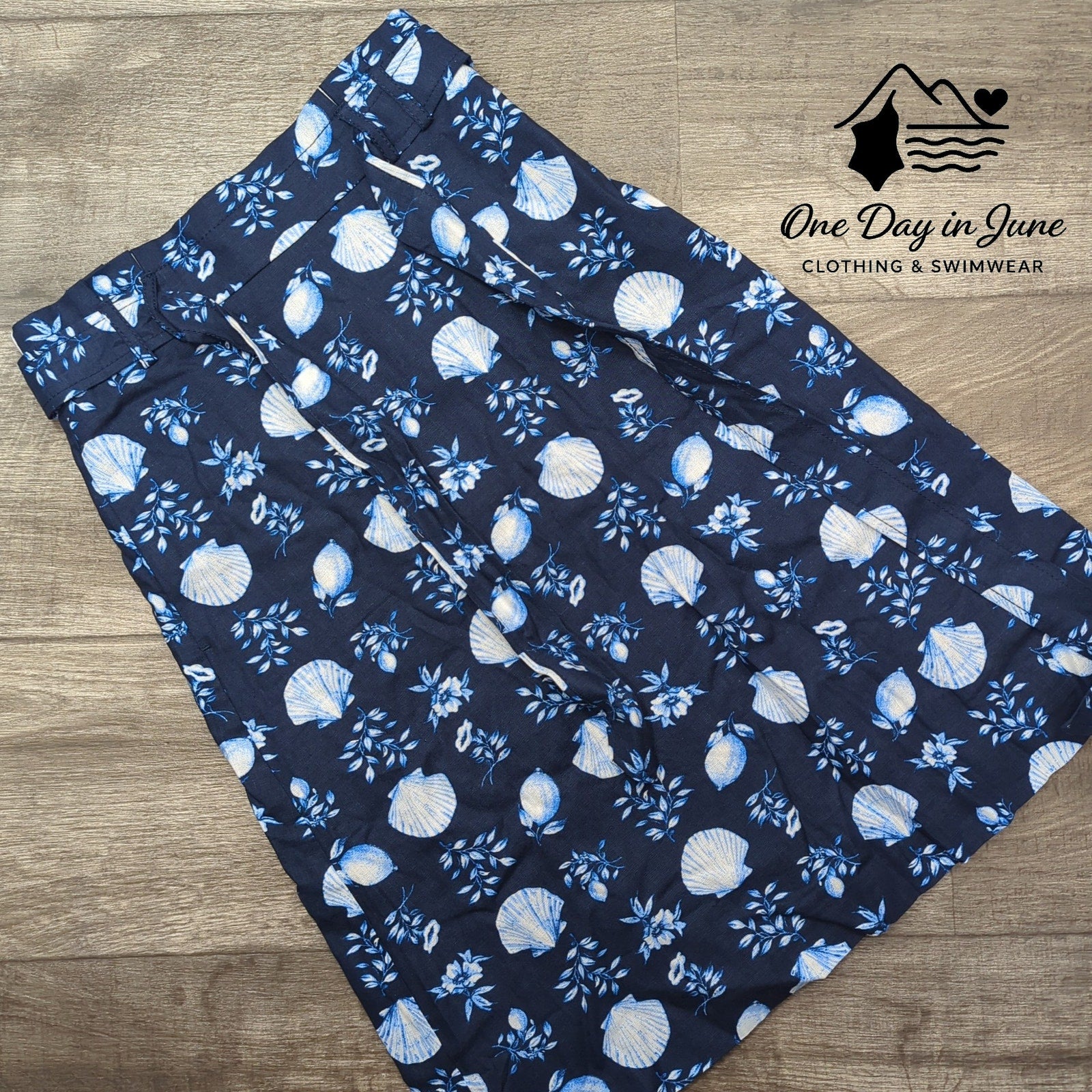 A most delightful midi skirt in the finest blue hue, crafted from a harmonious blend of linen and viscose with a practical polyester lining for the lady of discerning taste. The charming floral pattern and elegant belt detail render it perfectly suited for garden parties, morning calls, or any occasion requiring both style and propriety. New with tags and awaiting its fortunate new mistress.