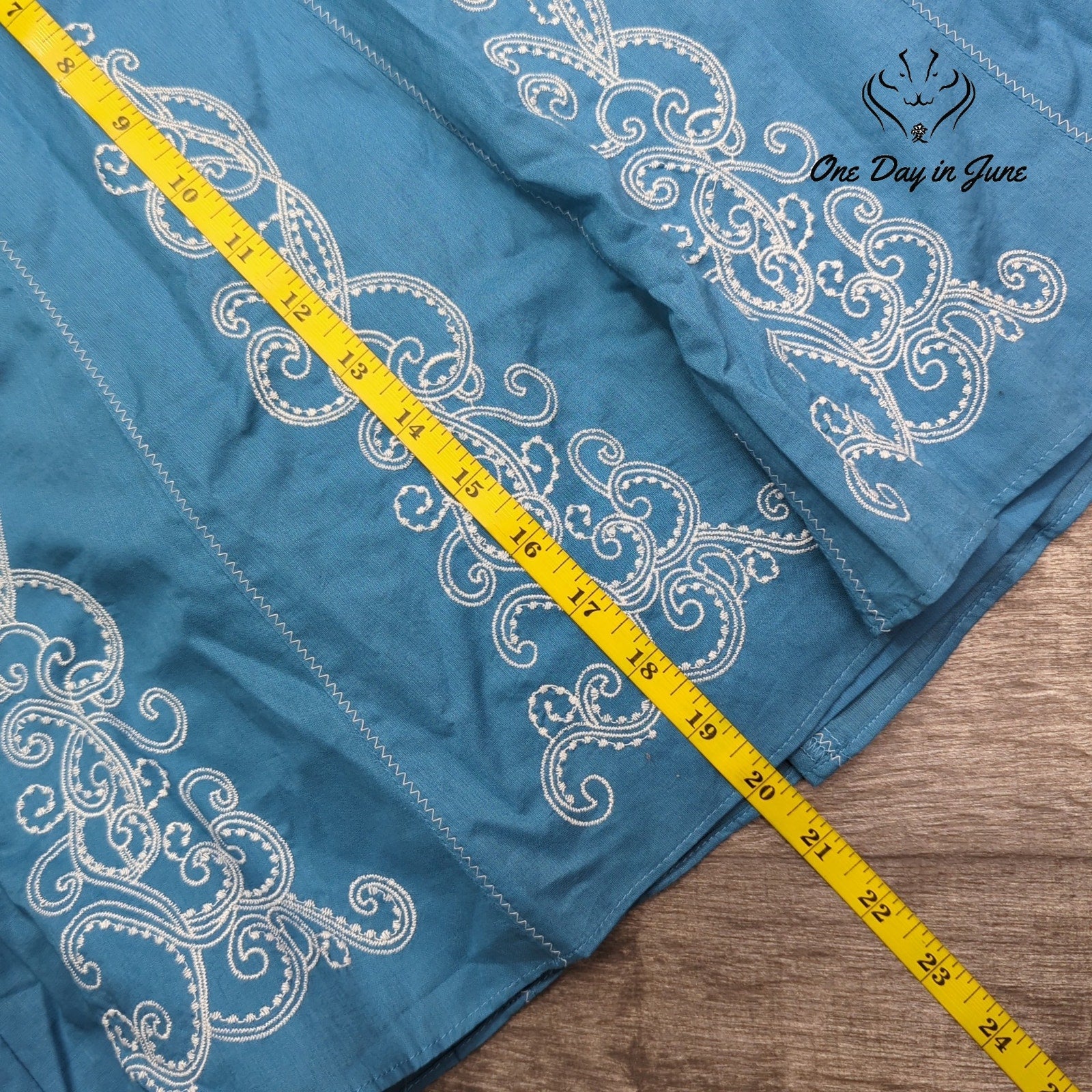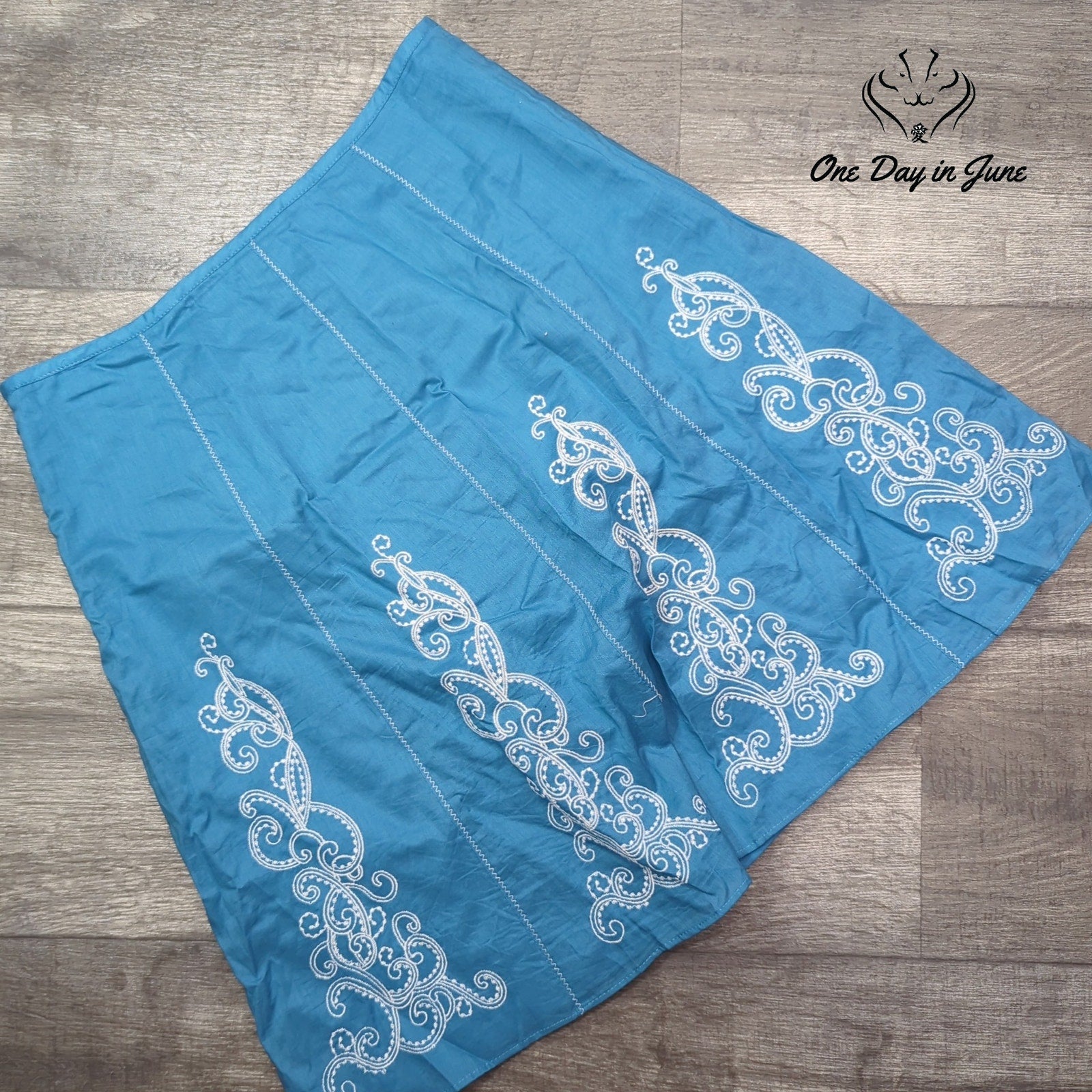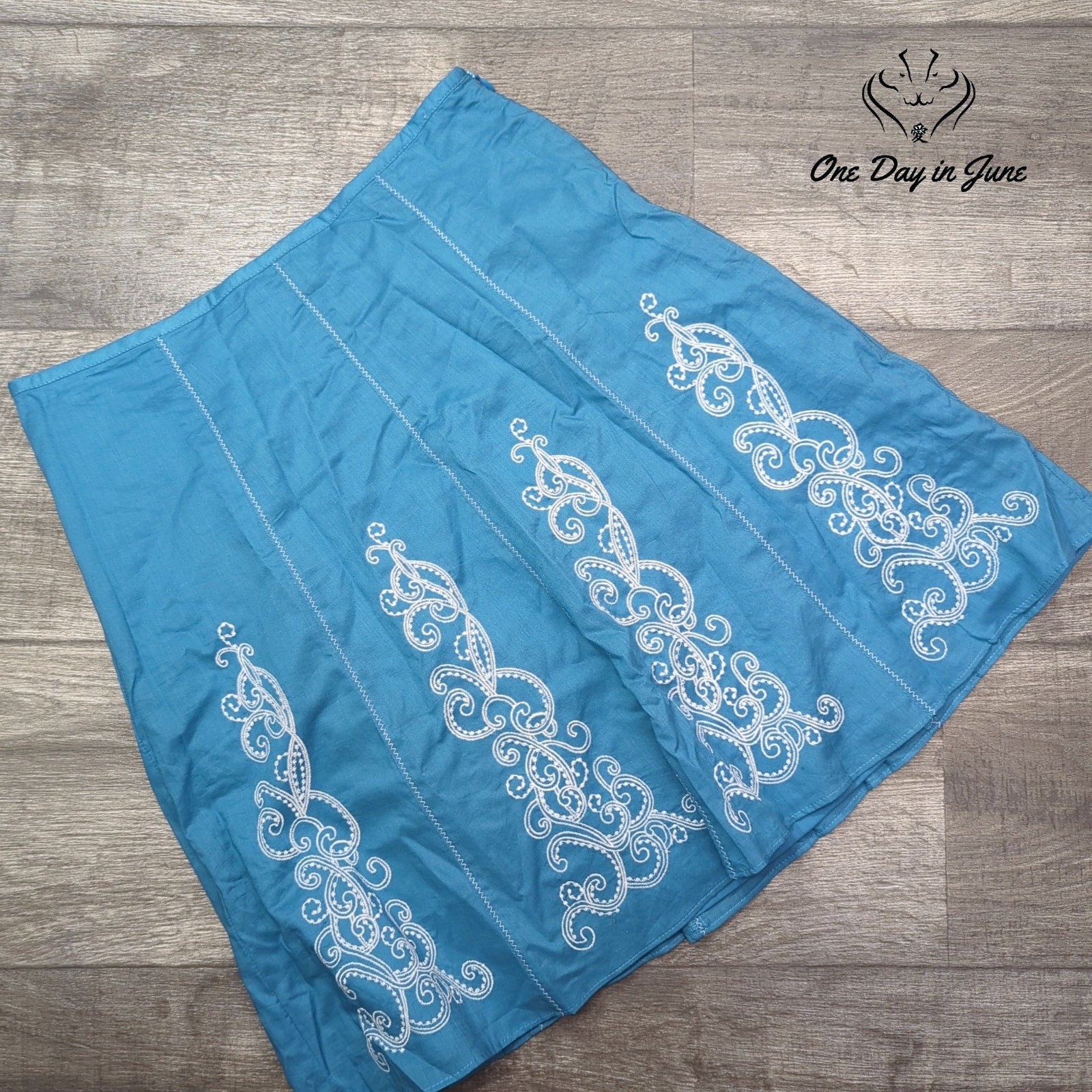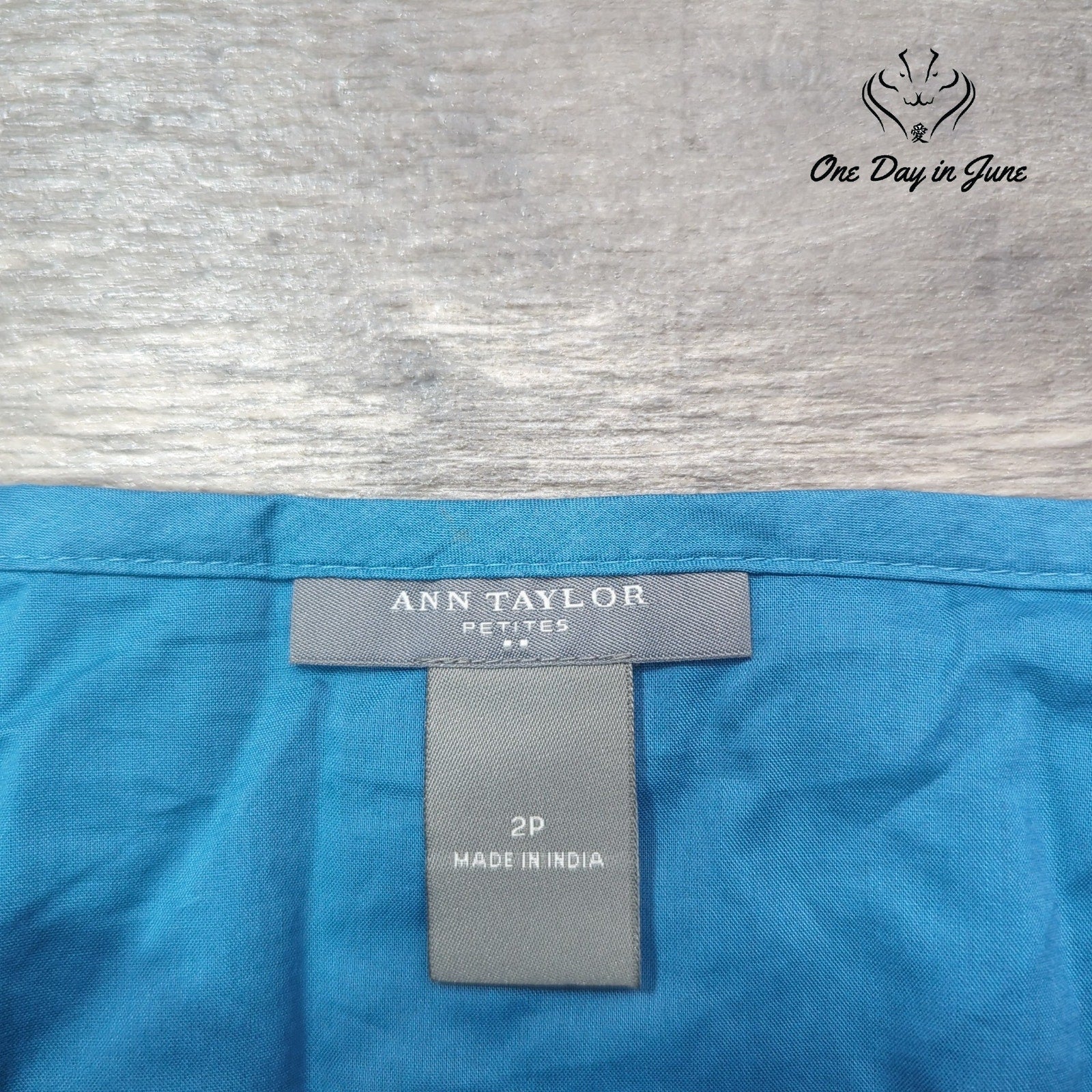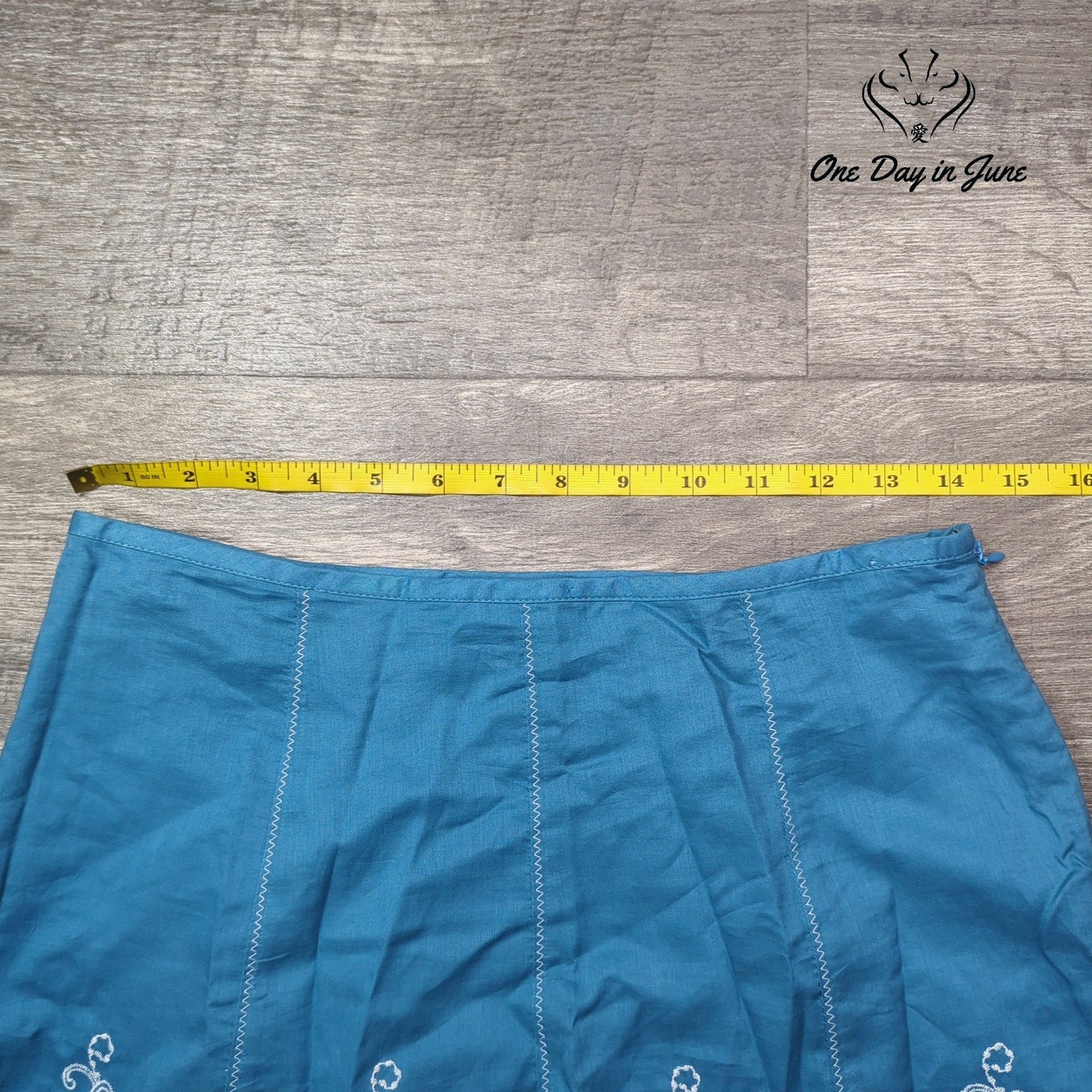 This charming embroidered mini skirt from Ann Taylor is a delightful addition to any lady's wardrobe. Its azure hue and intricate needlework lend an air of sophistication, while the cotton fabric ensures comfort for all manner of social engagements. In a condition that can only be described as nearly pristine, this garment is sure to become a treasured piece for the discerning woman of fashion.