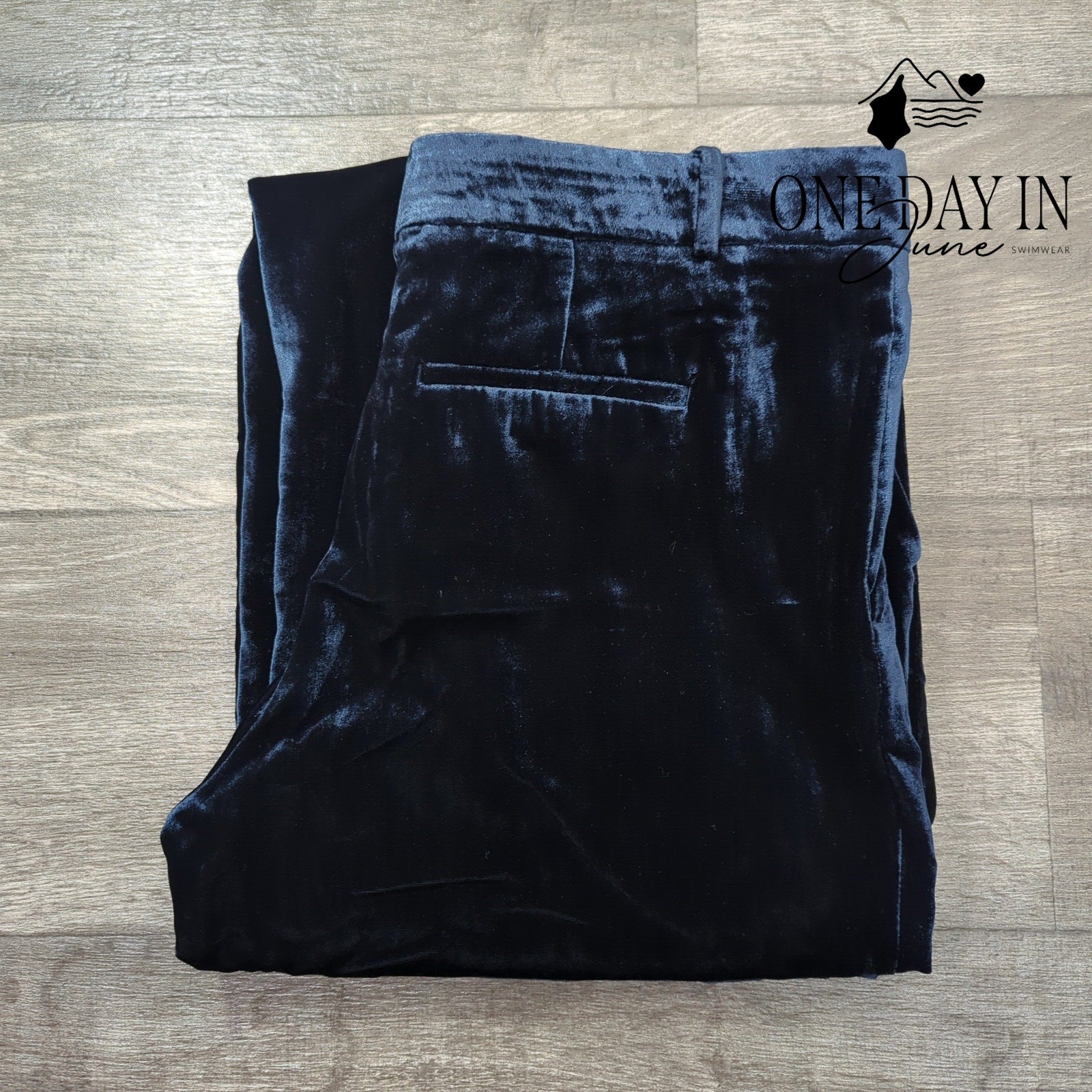 A most elegant pair of wide leg trousers in a rich navy velveteen, certain to elevate any lady's winter wardrobe with their luxurious drape and refined silhouette. The generous cut allows for both comfort and style, while the sumptuous fabric lends an air of sophistication to even the simplest of ensembles. New with tags and ready to accompany you to all manner of social engagements.