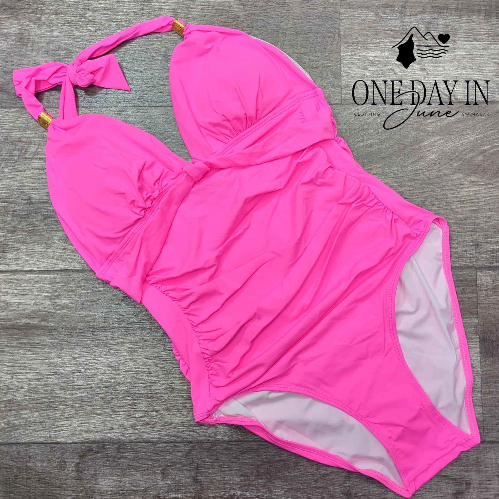 This enchanting halter one-piece captures summer's most romantic spirit with its blush-pink hue that whispers of garden parties and seaside soirées. Crafted with the modern woman's confidence in mind, it offers flattering tummy control while maintaining an air of effortless sophistication. A pristine addition to any discerning lady's swim collection, this piece promises to transform poolside moments into memories worthy of the finest novels.