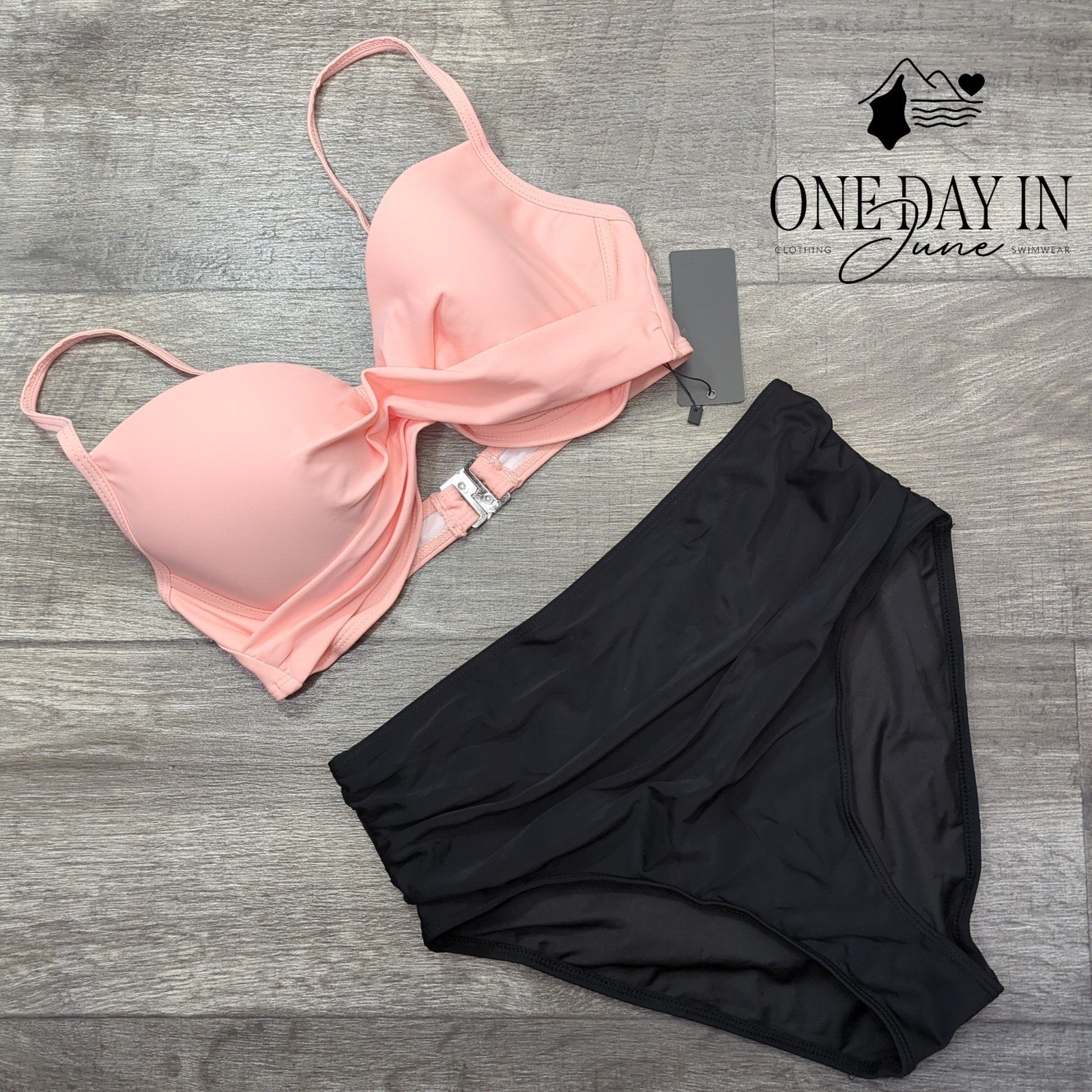 This peach and black bikini brings summer magic with a splash, featuring a high waist design and molded cups that make quite the stylish dash! Made with stretchy polyester and spandex so fine, this swimsuit will make you look absolutely divine!