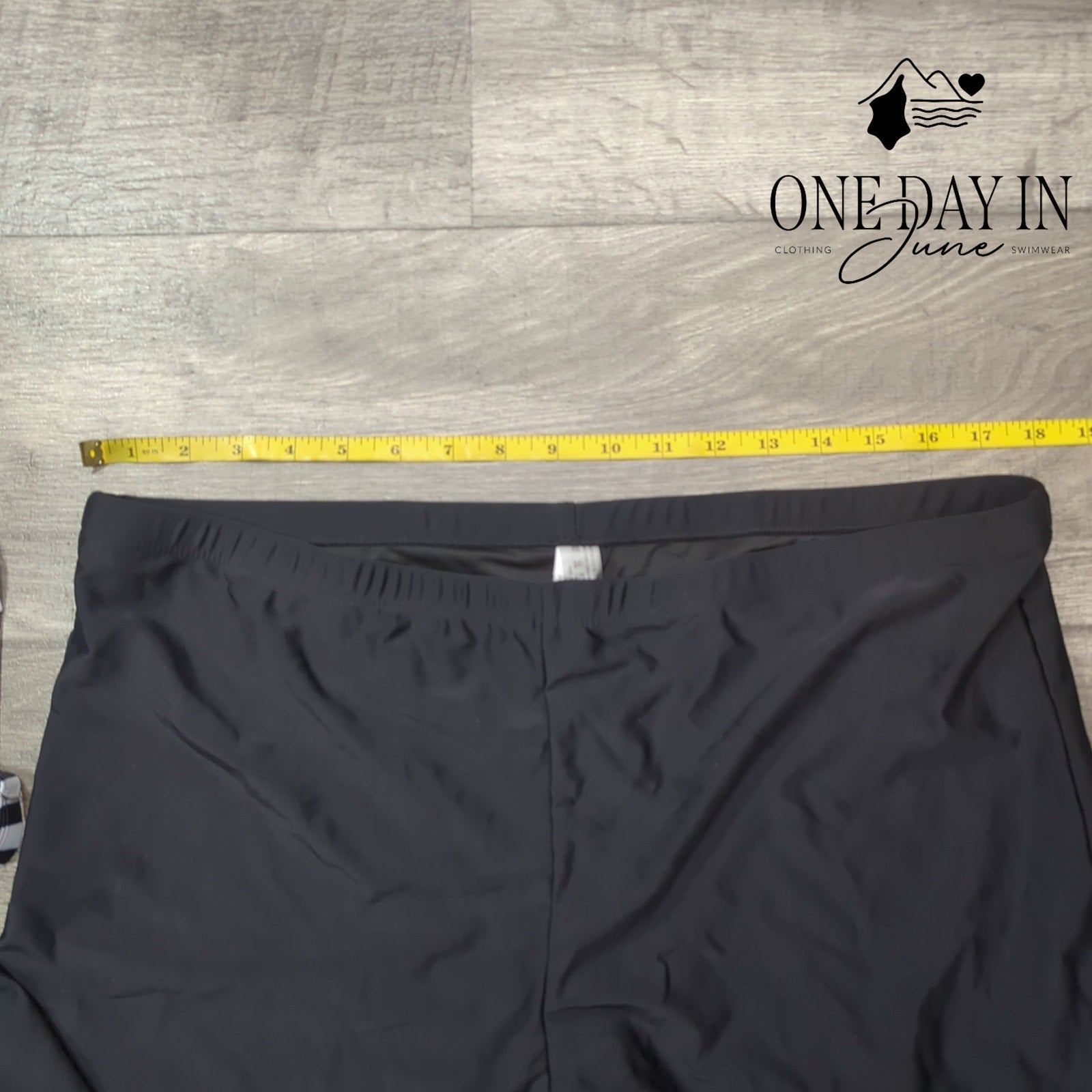 This splendid swimsuit is black as night, with a cross-front design that's quite a sight! The boyshort bottom and tankini top will make you look fantastic from bottom to top!
