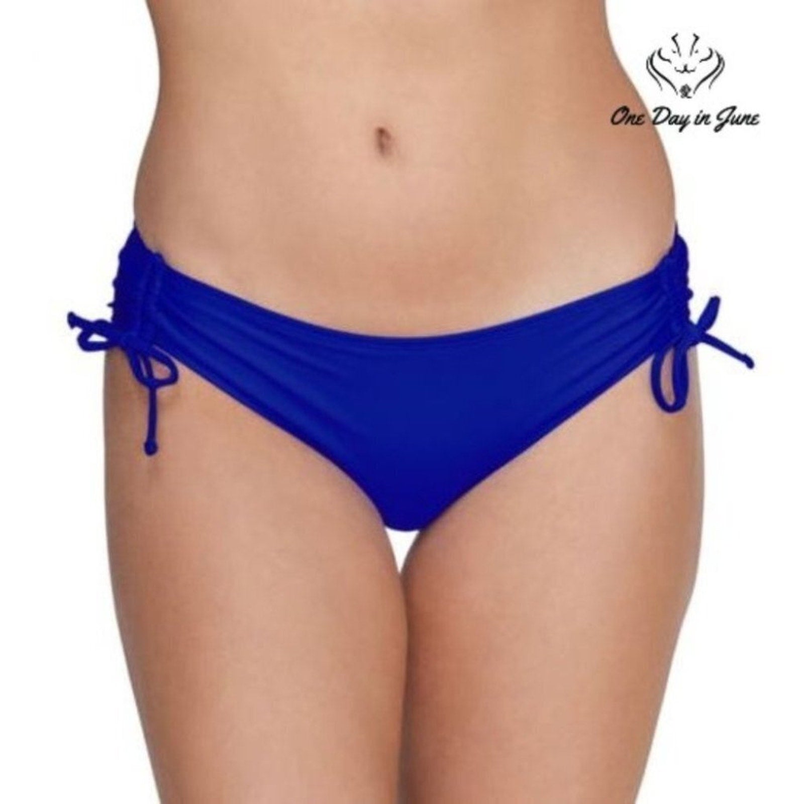 This delightfully charming bikini bottom in the most becoming shade of blue promises to flatter any young lady's summer ensemble. The well-crafted piece, fashioned from a divine blend of polyester and spandex, offers both comfort and elegance while maintaining its shape with the utmost propriety. New and unworn, it bears its original markings of quality from the esteemed house of Arizona Jean Co.