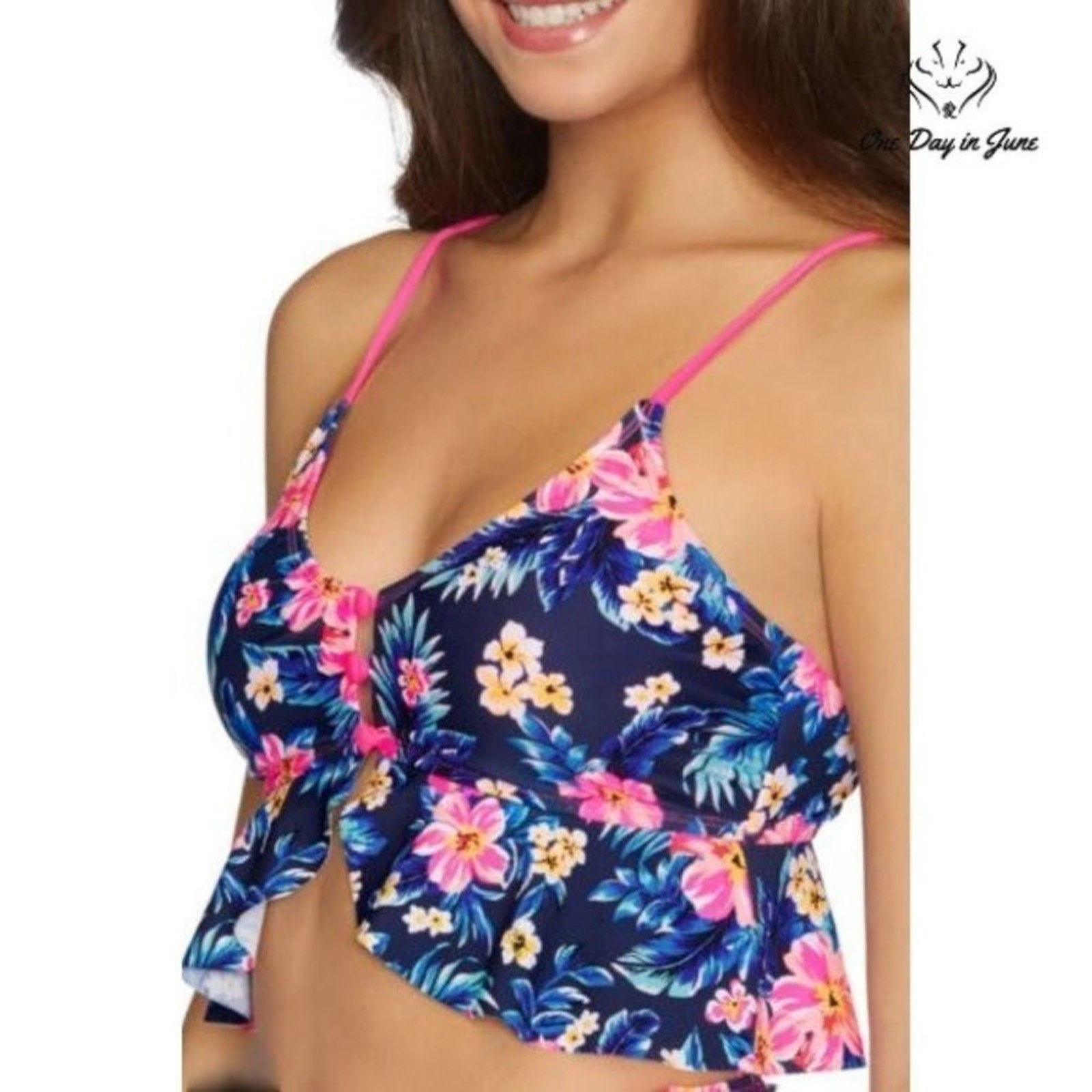 A symphony of blue and pink adorns this enchanting bralette bikini top, a delightful confection from Arizona Jean Co. This brand new piece, crafted from a whisper-soft blend of polyester and spandex, promises to be the perfect companion for sun-drenched days and moonlit nights by the shore.