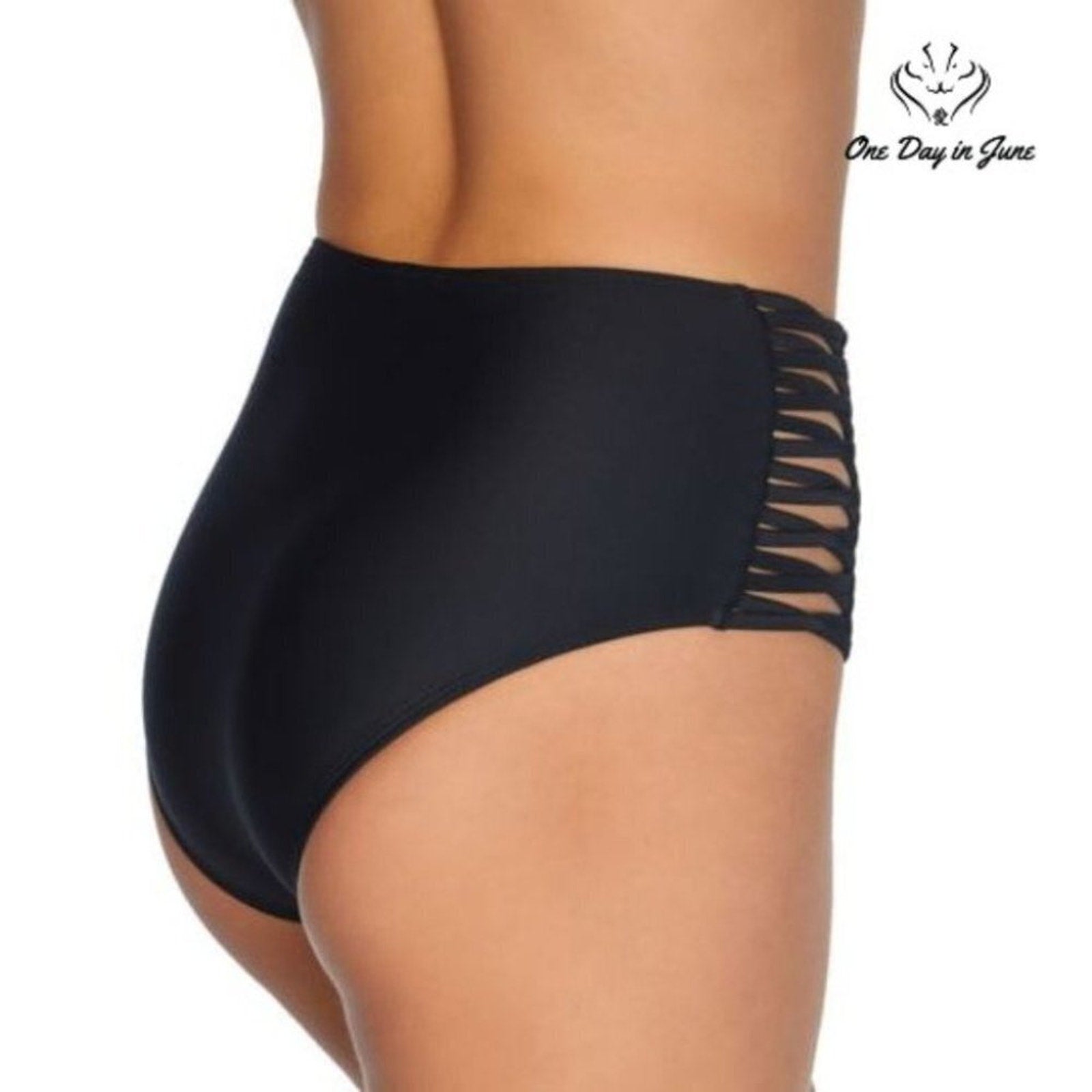Sleek black high-waisted bikini bottoms that capture modern sophistication with timeless allure. This Arizona Jean Co. design blends comfort with grace, crafted from a luxurious polyester-spandex blend that embraces every curve with effortless elegance.