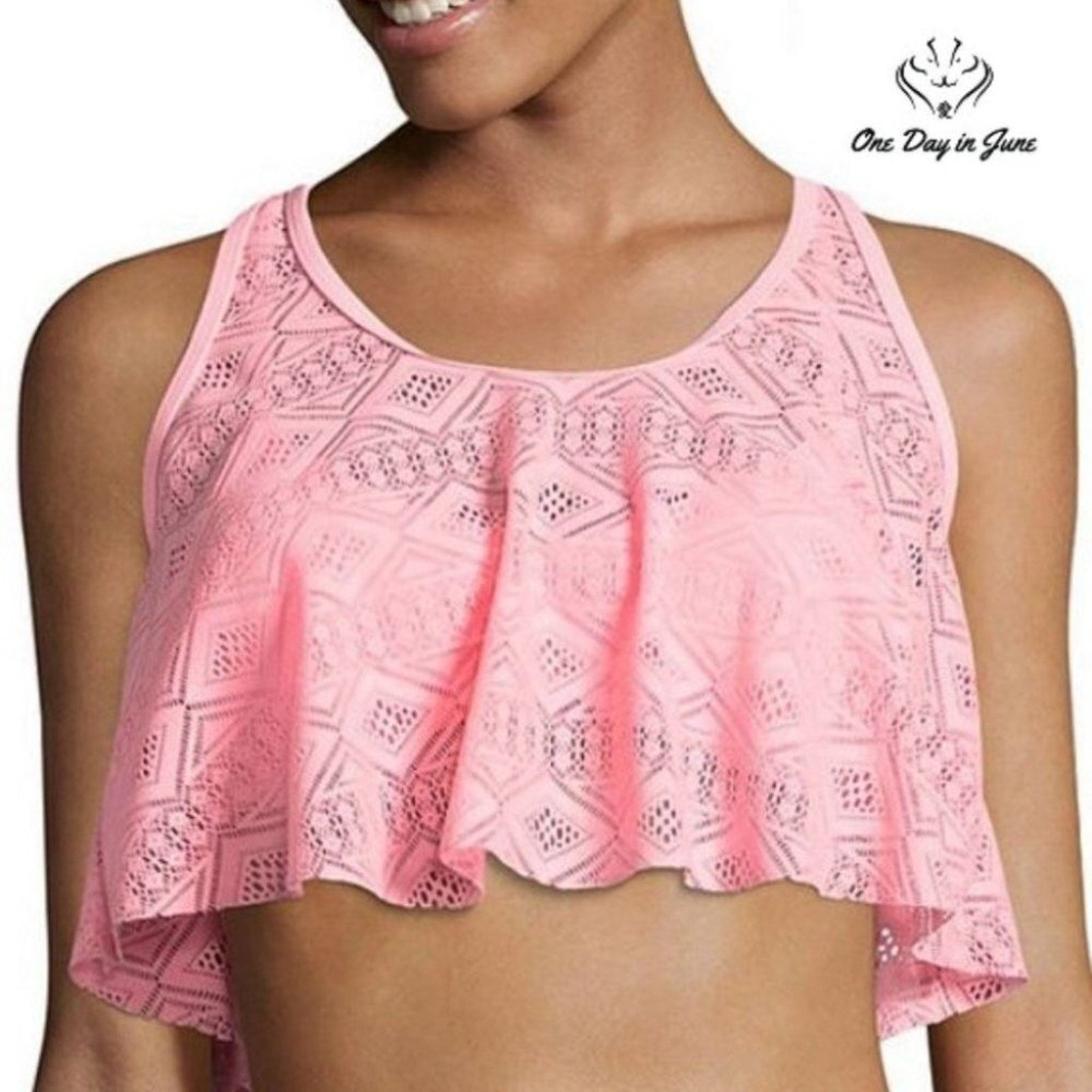 Oh, what a delight, this peachy tankini, a splendid sight to see, with ruffles that dance so splendidly! Brand new with tags intact, this Arizona Jean Co. swim top is ready to make a splash, with stretchy fabric that moves and flows, perfect for beach days and pool-side shows.