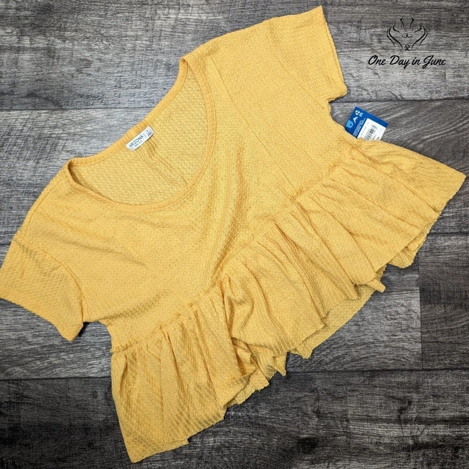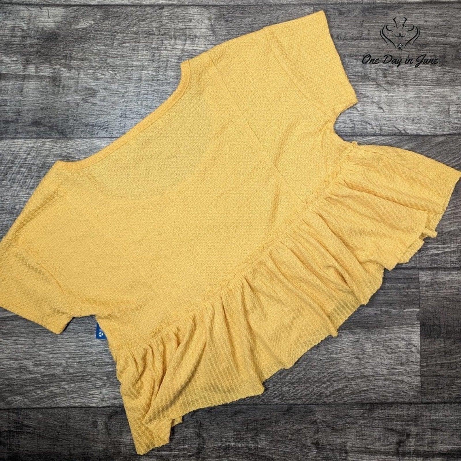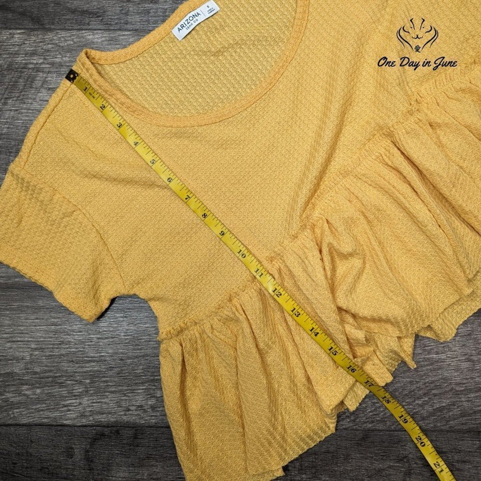 In a blinding flash of sun-yellow, the Arizona Jean Co. has birthed this rambunctious, new-with-tags beast of a top, textured and pulsating with the lifeblood of polyester/spandex. Born for the intrepid maverick, this junior women's top whispers of desert canyons and wild stallions, serenading the daring soul who dares to tame its vibrant vibrato.