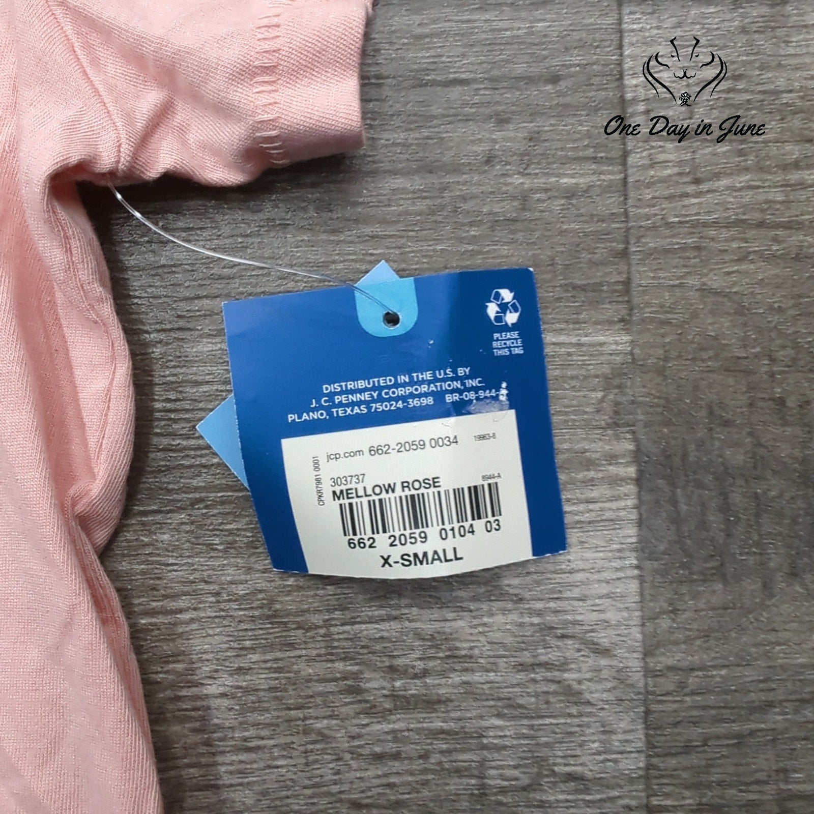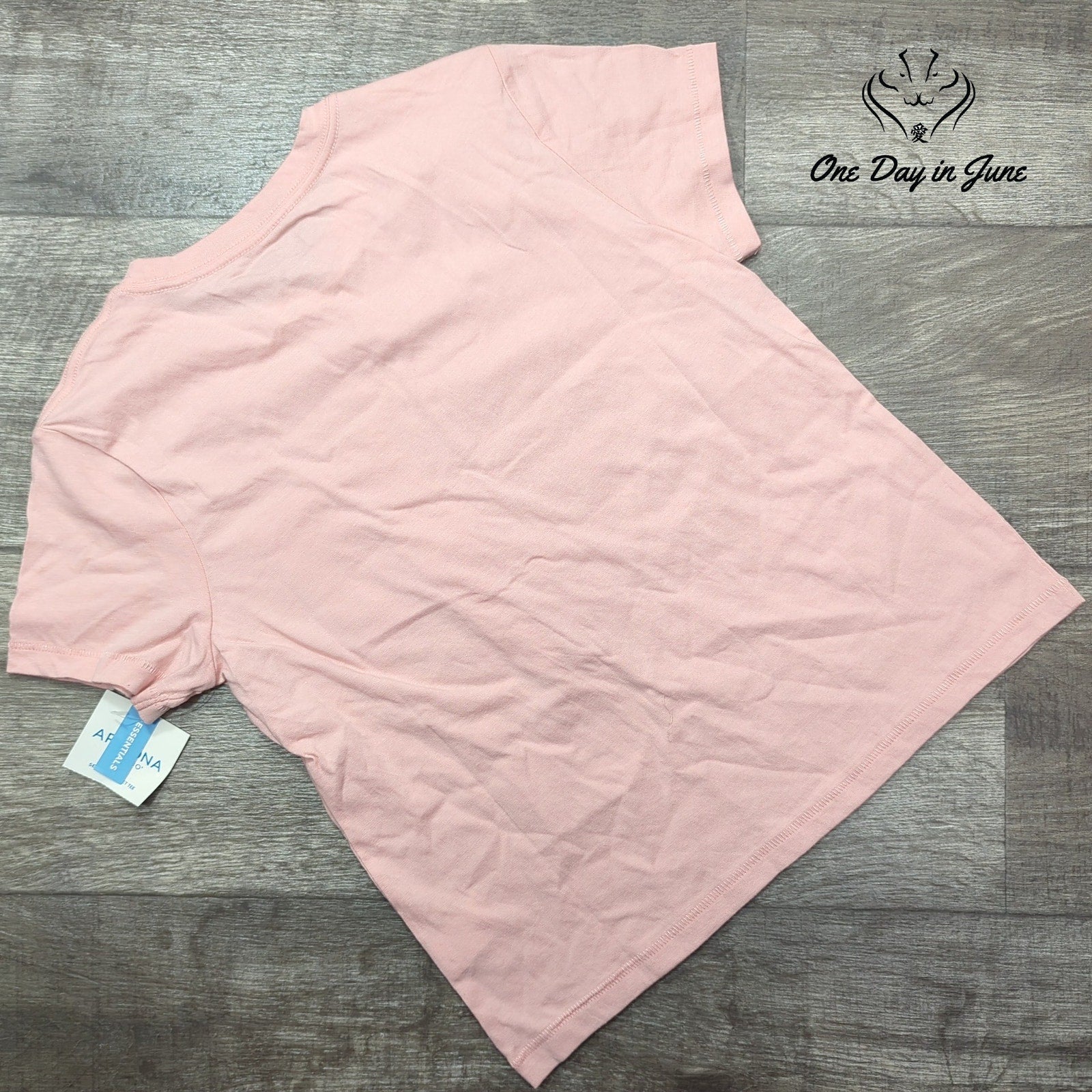 A delightfully charming pink tee shirt, crafted from a most agreeable blend of cotton and polyester for both comfort and durability. This new Arizona Jean Co. short-sleeved garment promises to be a most sensible addition to any young lady's wardrobe, being both practical for daily pursuits and possessed of a becoming simplicity.