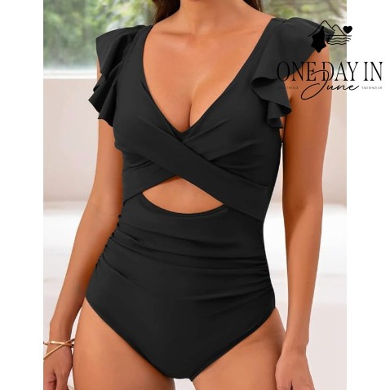 This splish-splash suit with ruffles so neat has a cross-front design that's quite the treat! With cut-out shoulders and black so bold, it's perfect for swimming when days are not cold!