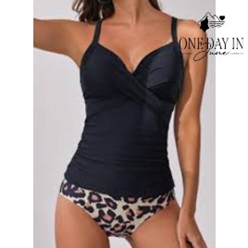 A most fetching leopard print tankini that shall render you quite the vision at any seaside gathering, with its artfully designed cross-front bodice and charming tie-back detail. The rich black and brown pattern speaks to a lady of discerning taste who is not afraid to make a striking impression upon the shore. Crafted from a delightfully stretchy blend of polyester and spandex, this elegant two-piece promises both comfort and confidence for your aquatic adventures.
