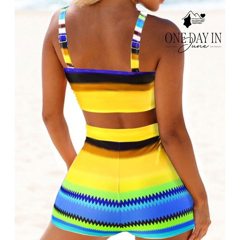 This bright and cheerful swimsuit will make you grin, with yellow and blue colors that shimmer and spin! The high-waisted boy short style is comfy and neat, perfect for splashing from your head to your feet!