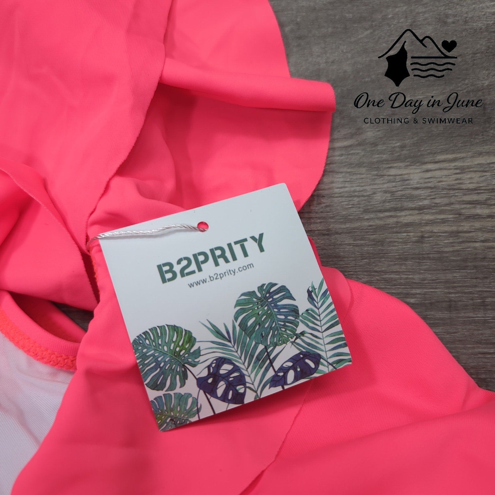 This elegant one-piece swimsuit cascades with delicate ruffles and a sophisticated cross-front design. It beckons for sunlit afternoons by azure waters, its vibrant pink hue a radiant promise of summer splendor. From B2Prity, crafted from a blend of polyester and spandex for comfort that endures through every seaside reverie.