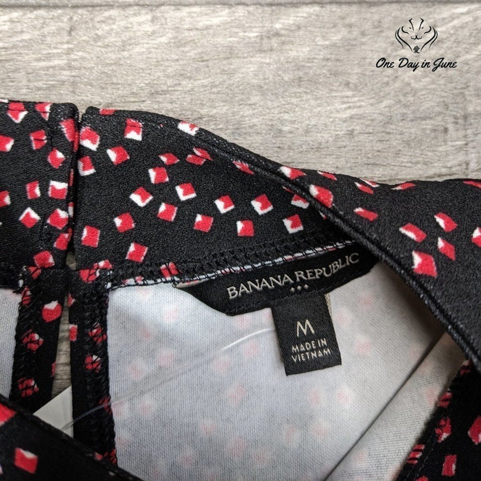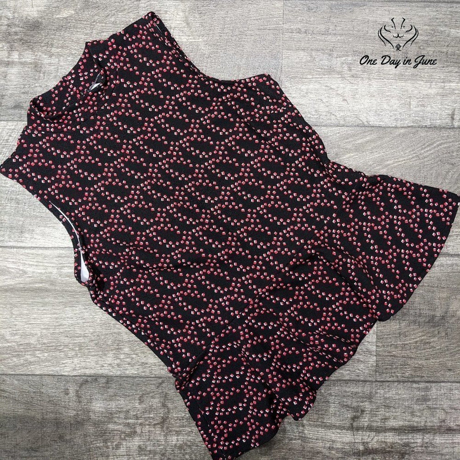 The savage dance of black and red swirls across this pristine sleeveless creation from Banana Republic, a garment that would make even the most hardened fashion critic weep with raw, unbridled joy. Like a twisted tango in fabric form, this stretchy polyester masterpiece clings and moves with a freedom that makes me question the very nature of reality - and I've seen some things, man, but nothing quite like the way this top ripples in the afternoon light.