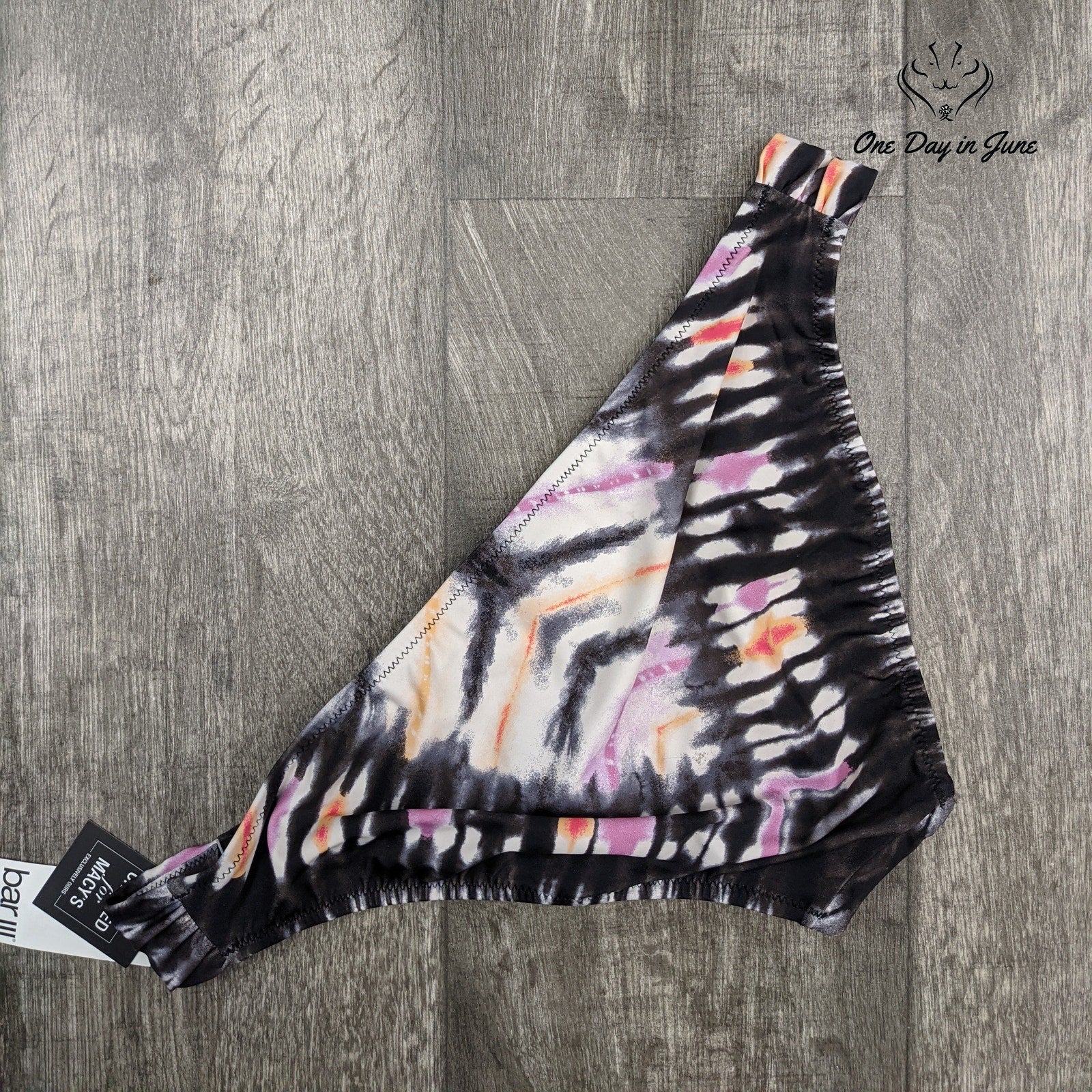 The kaleidoscopic swirls of midnight and alabaster dance across this hypnotic bikini bottom like a fever dream in the Nevada desert, twisting and writhing their way through space and time. These Bar III bottoms possess a mystical quality that transcends mere swimwear, manifesting as some sort of cosmic revelation against the harsh backdrop of reality - and the spandex-polyester blend hugs curves like a python with separation anxiety.