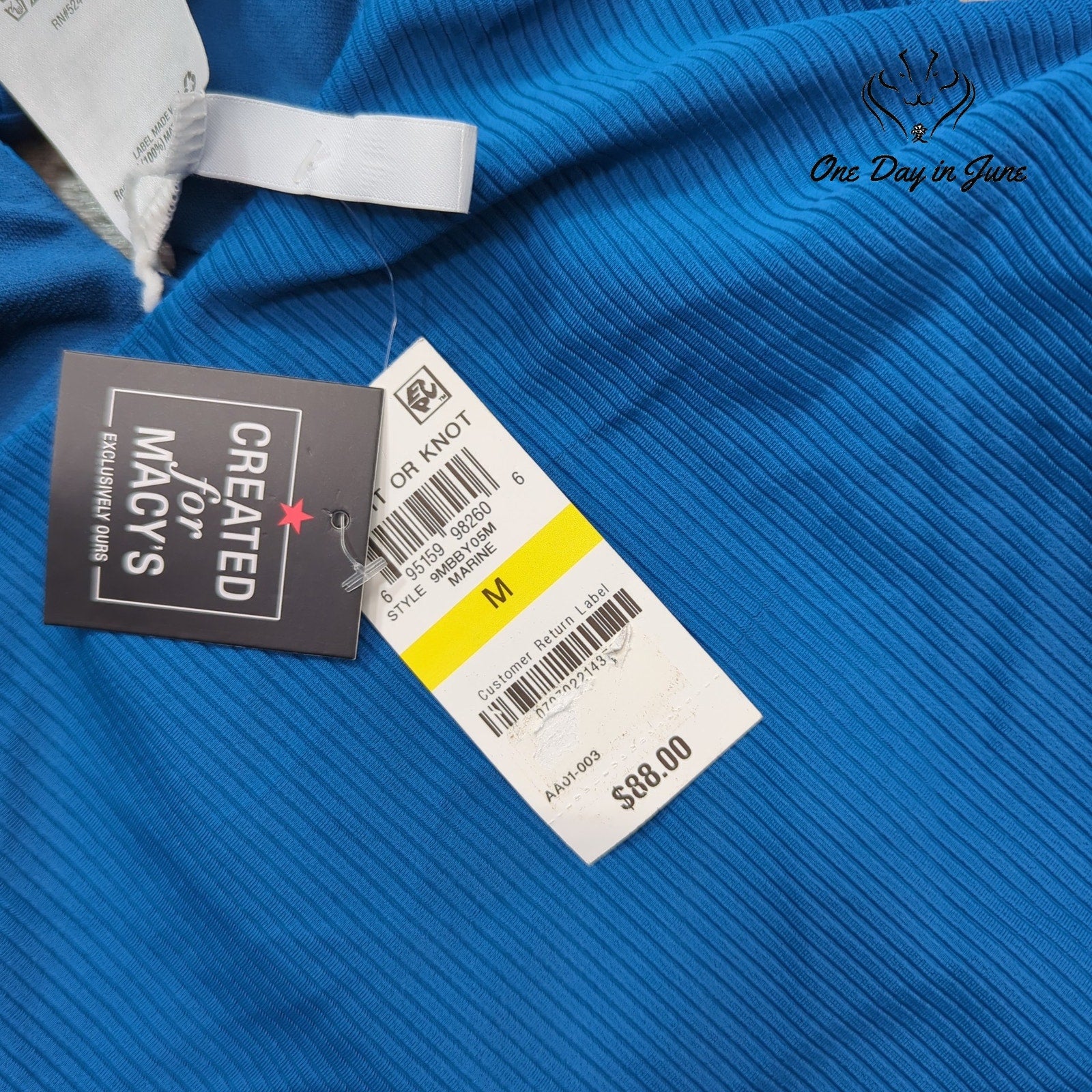 A most becoming swimsuit for the discerning lady, this Bar III creation boasts a charming ribbed texture and an intriguing knotted detail. The azure hue is reminiscent of the clearest summer sky, while the one-piece design offers both modesty and elegance for seaside promenades or leisurely dips in the lake.