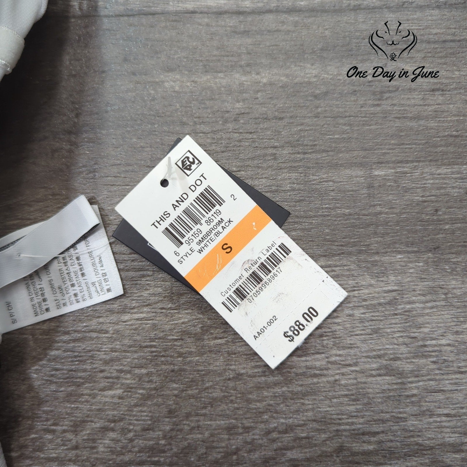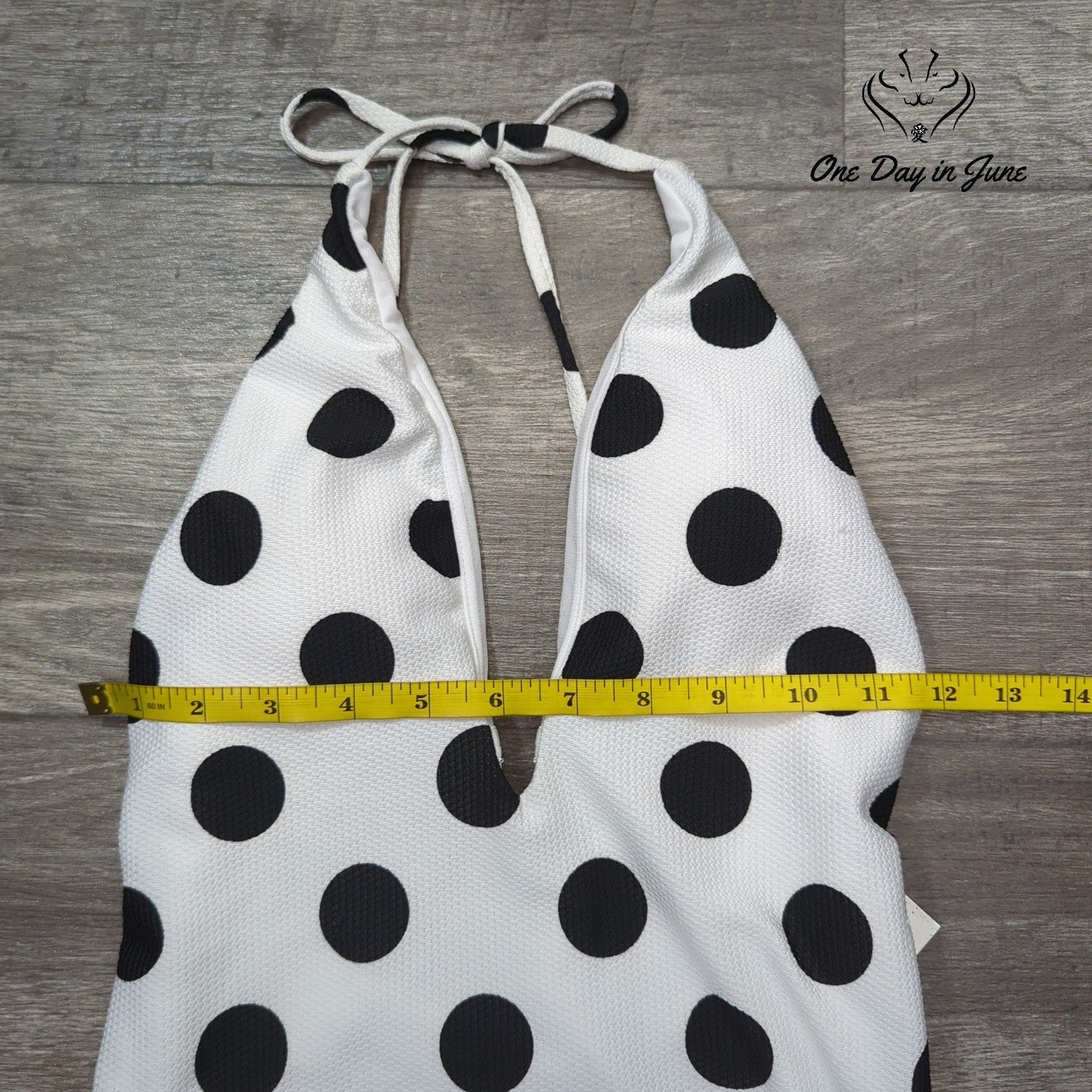 In a world gone mad with conformity, this Bar III swimsuit emerges as a beacon of rebellious style, its black and white dots dancing like a fever dream across the fabric. It's a one-piece manifestation of the cosmic giggle, a sartorial middle finger to the bland and boring, ready to plunge you into a chlorinated pool of weirdness and wonder.
