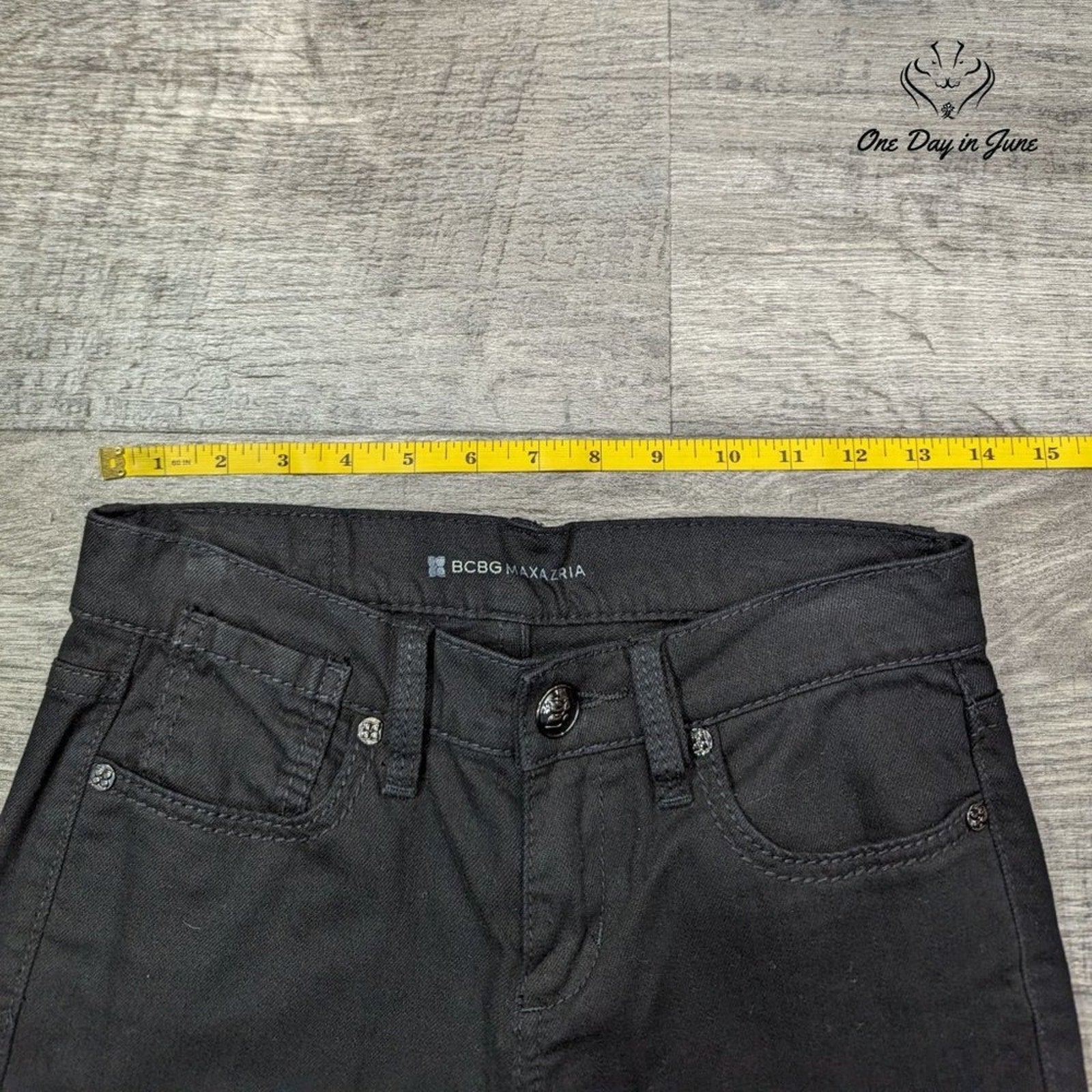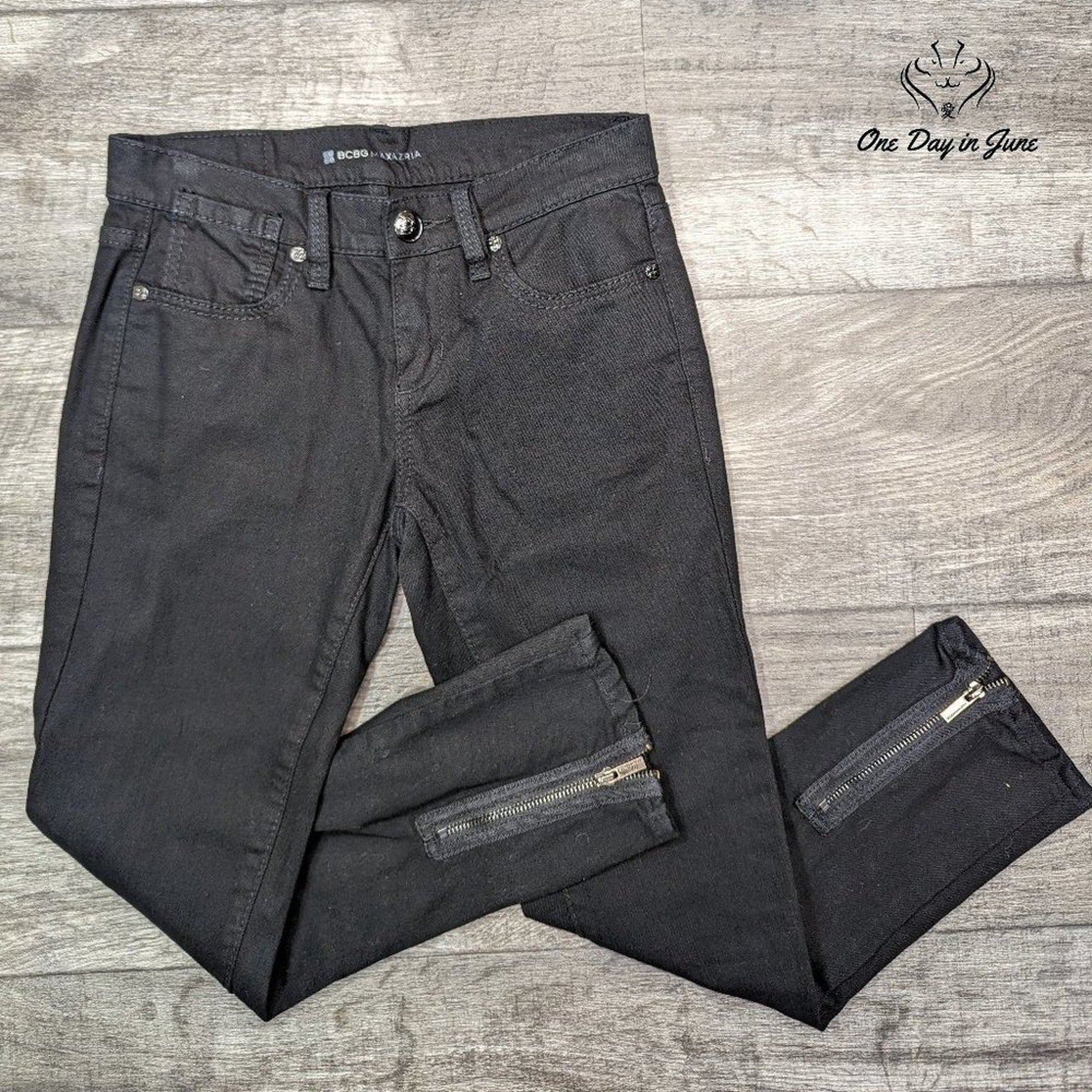 Permit me to present you these gently used BCBGMaxazria ankle jeans, a harmonious blend of cotton and elastane in the most classic of hues, black. Ideal for the discerning woman, they meld comfort and style with an air of understated elegance.