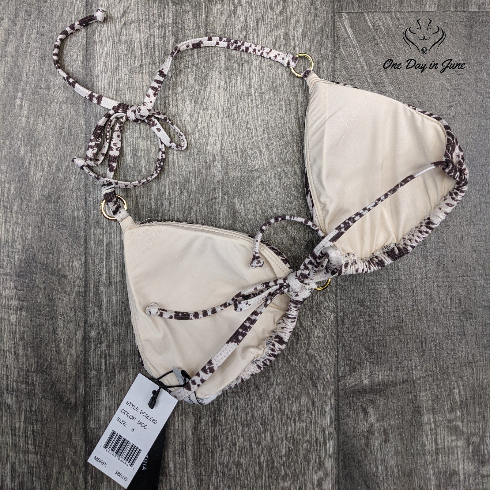Indulge in the allure of this exquisite BCBGMAXAZRIA bikini top, adorned with a captivating snake skin pattern that is certain to turn heads at any seaside gathering. The strappy triangle design offers a flattering silhouette, while the polyester and spandex blend ensures both comfort and a becoming fit for the discerning lady of fashion.