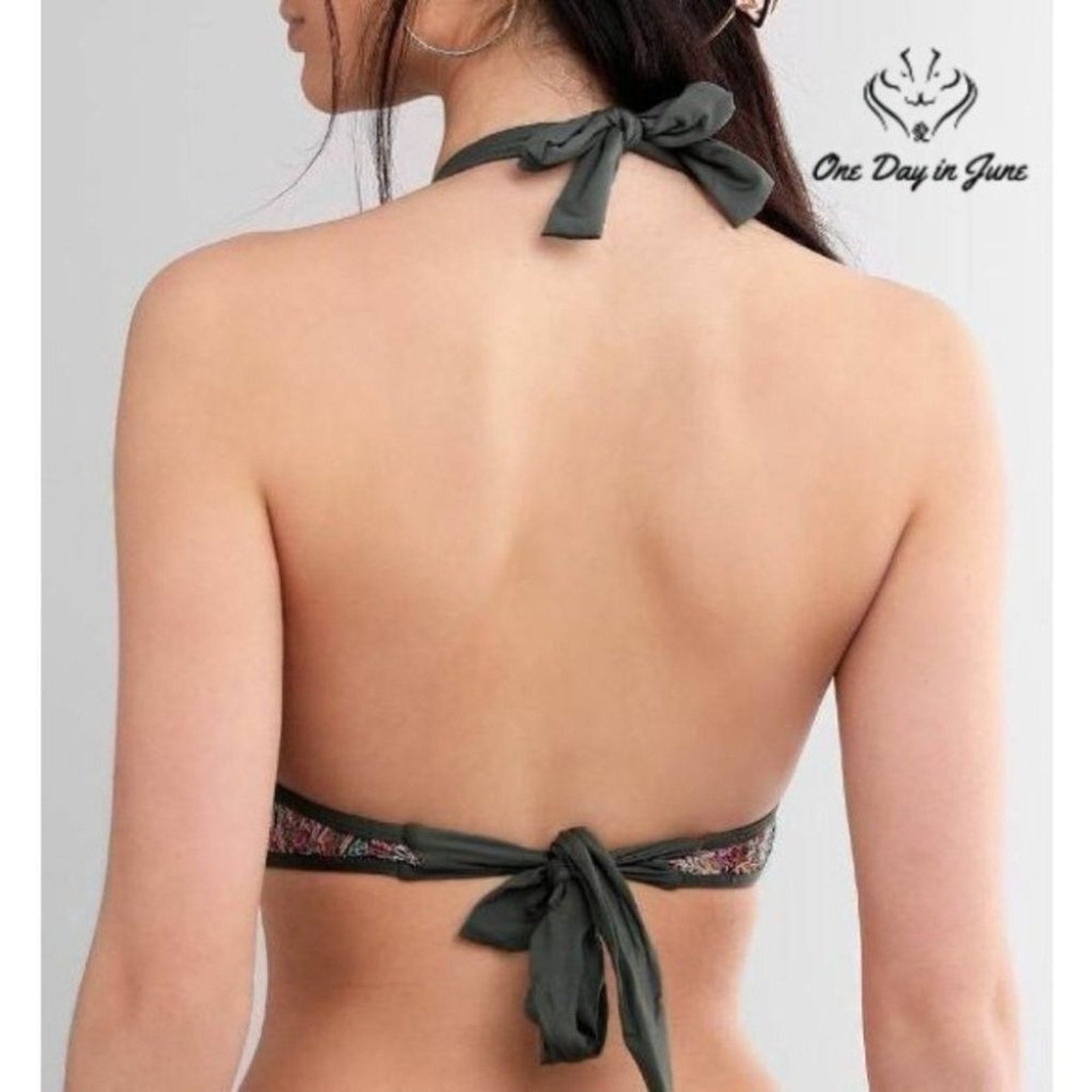 A dazzling halter swim top from Becca Courtney beckons with its enchanting palette of emerald and kaleidoscopic hues. Crafted from soft polyester and spandex with meticulous attention to detail, this pristine piece promises poolside glamour and effortless grace worthy of a Riviera holiday.