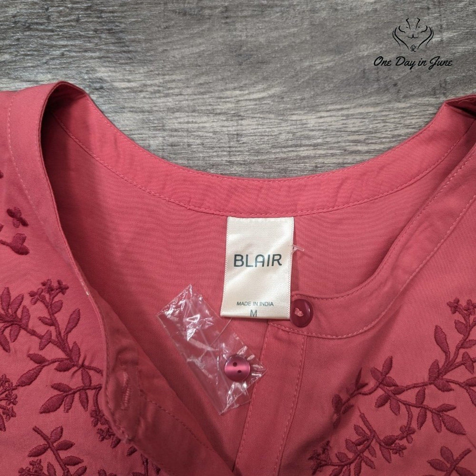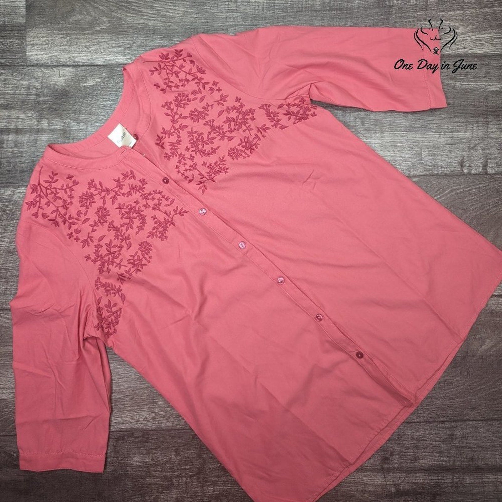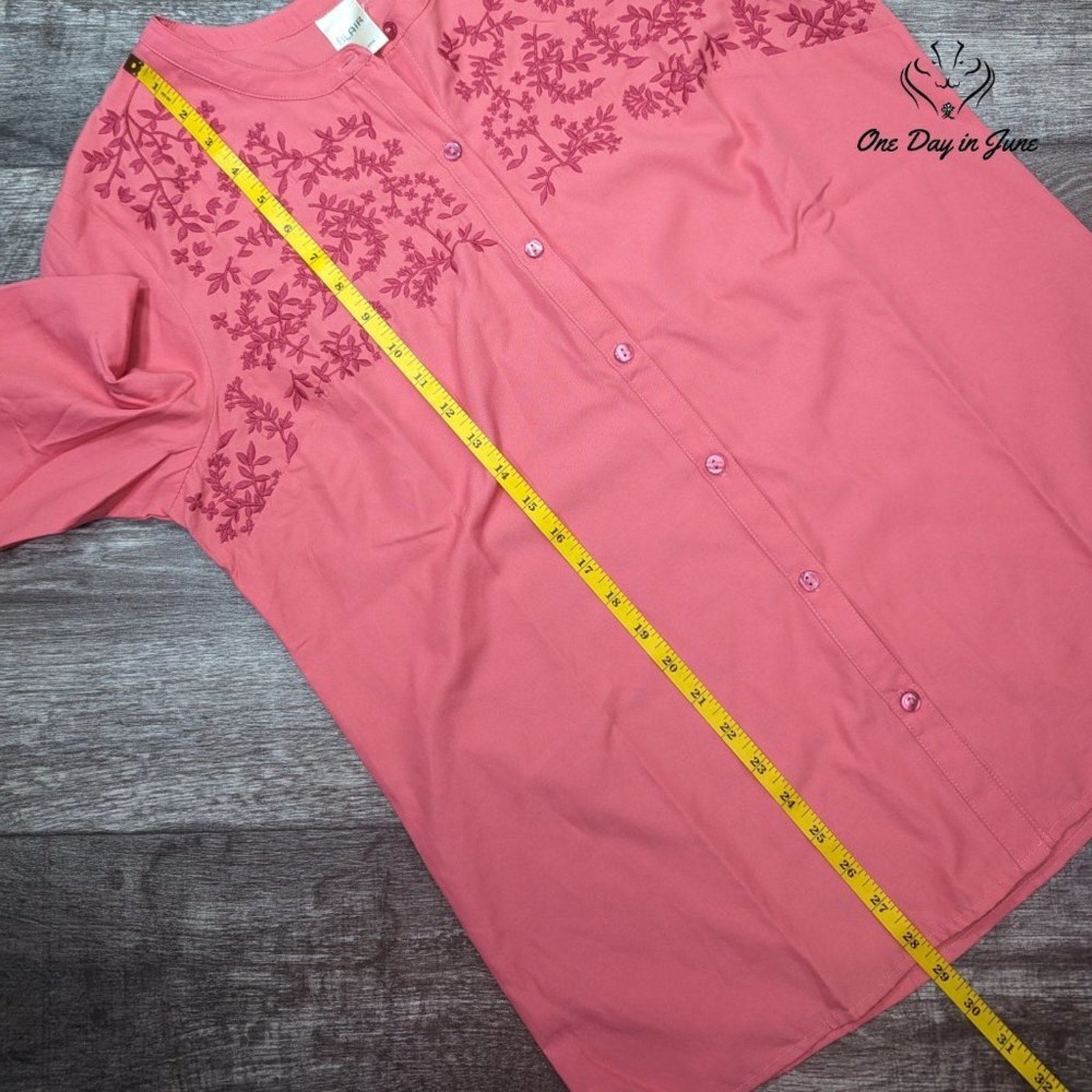 Dive into a kaleidoscope of coral, this Blair 3/4 sleeve button-front top is a symphony of polyester and rayon. Brand new, still cradles the newborn whisper of untouched tags. A wildcard in a mundane wardrobe, this piece is a testament to those daring enough to confront the ordinary.