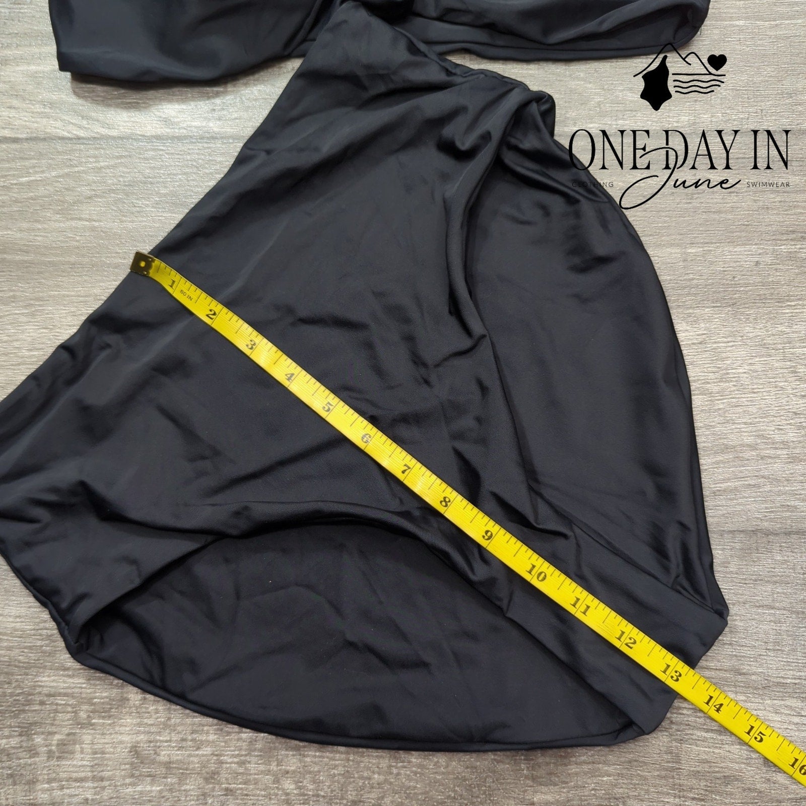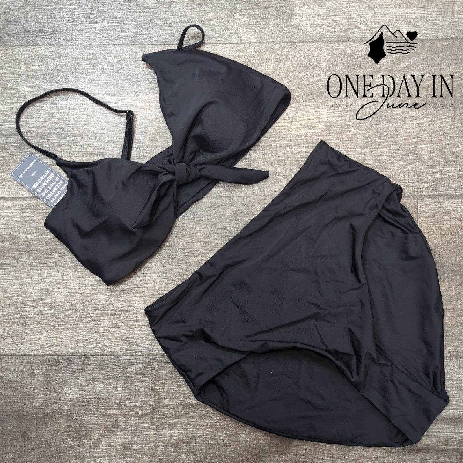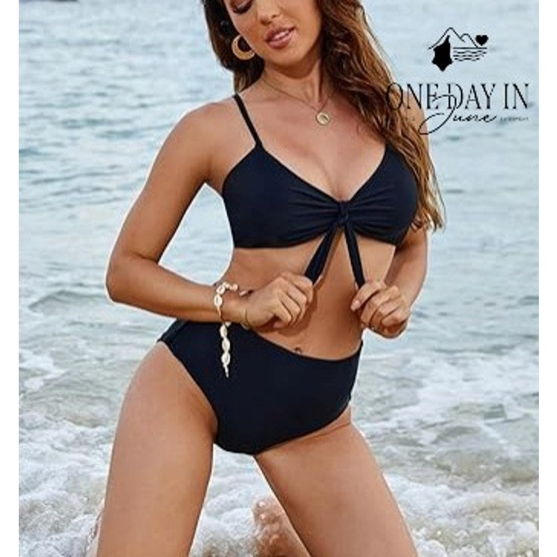 This elegant black bikini captures the essence of sophisticated beachside glamour with its artfully knotted front detail and flattering high-waisted silhouette. Crafted from a luxurious blend of polyester and spandex, it promises both comfort and allure for your seaside adventures. A timeless piece that whispers of moonlit shores and champagne sunsets.