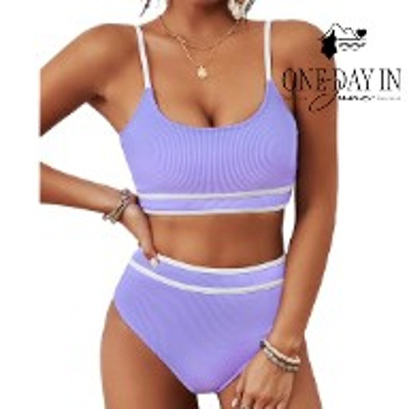 A vision of amethyst elegance emerges from this high-waisted bikini, where ribbed texture meets the timeless allure of cropped sophistication. This enchanting two-piece whispers of summer afternoons spent poolside, its rich purple hue capturing the very essence of luxurious leisure. Like a perfectly crafted cocktail, the blend of polyester and spandex ensures both comfort and grace for the modern woman's aquatic adventures.