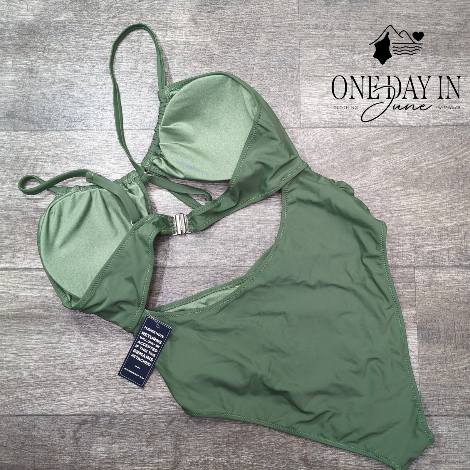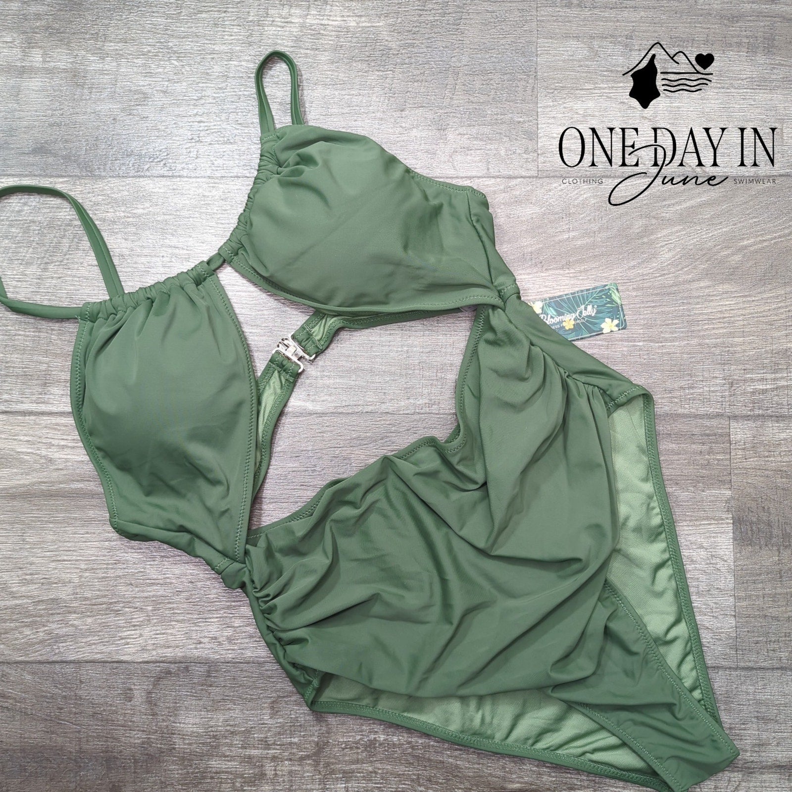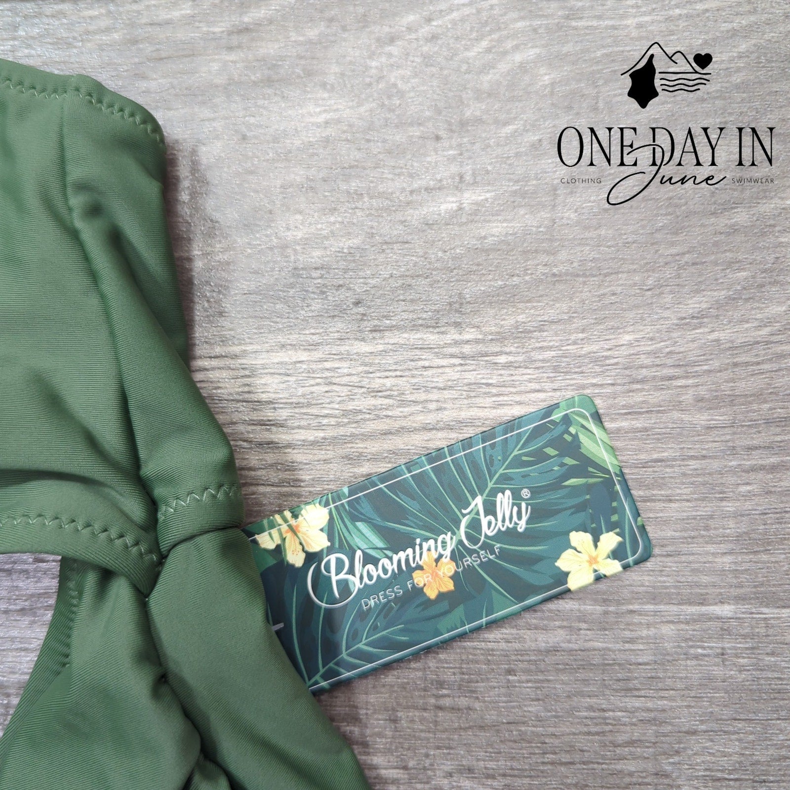 This green one-piece swimsuit hits like a revelation in the desert heat, with its strategic cutout design and tummy control technology that'll have you feeling like a goddess emerging from the crystalline waters of some impossible lagoon. The Blooming Jelly masterpiece wraps around your form with the precision of a master craftsman, that polyester-spandex blend moving like liquid mercury against skin that's been kissed by too much sun and not enough sleep. Brand new with tags still attached, this aquatic armor is ready for whatever chaos the poolside apocalypse might bring your way.