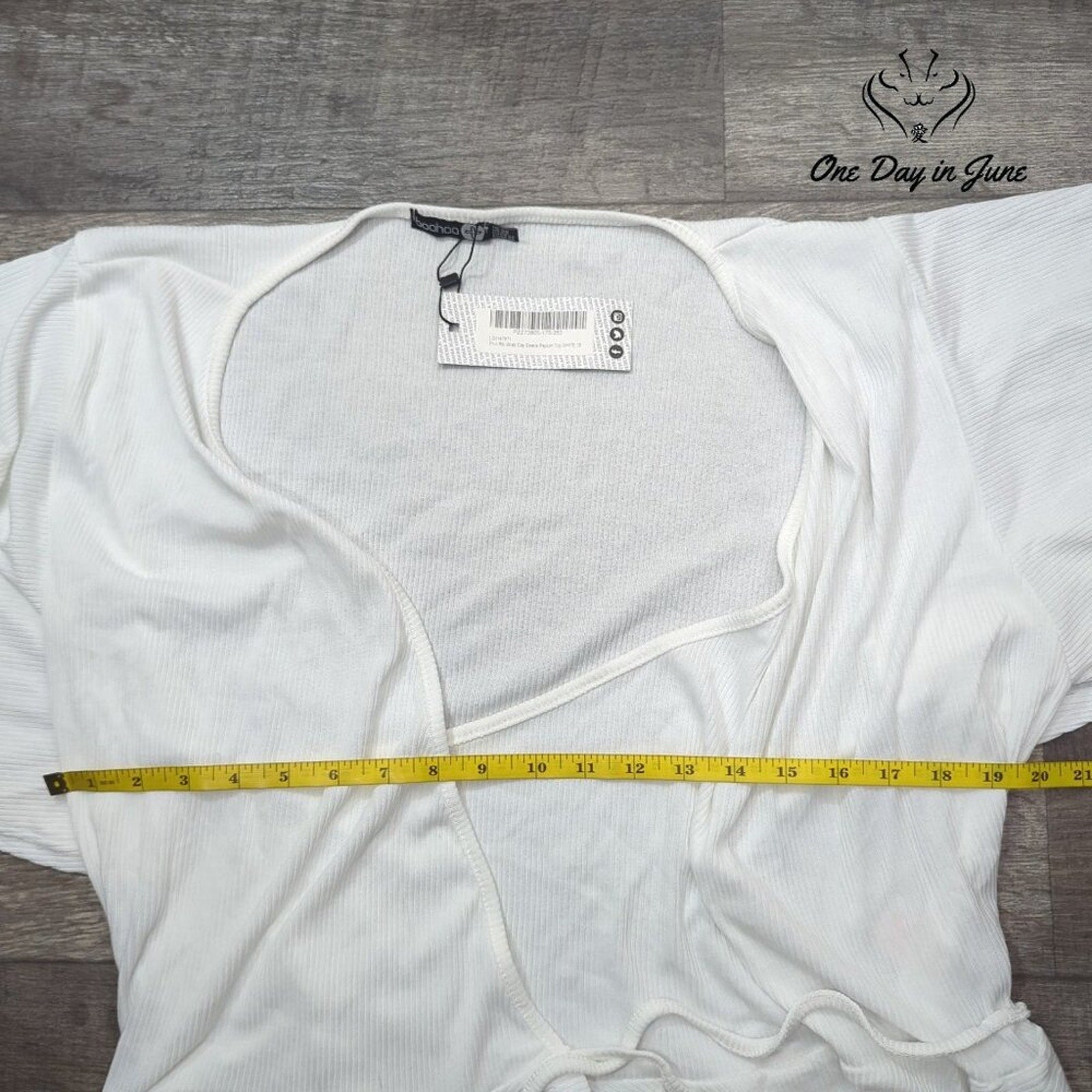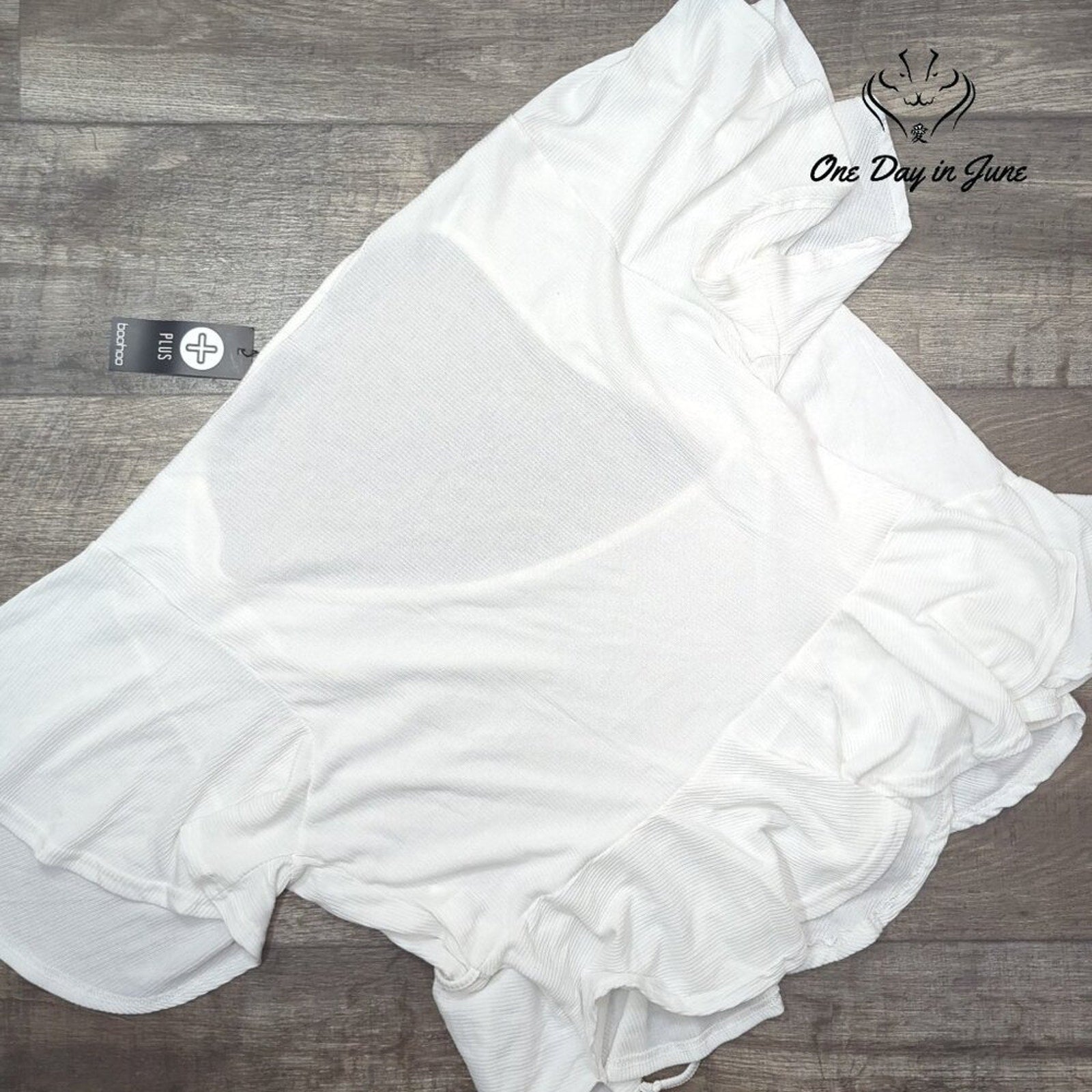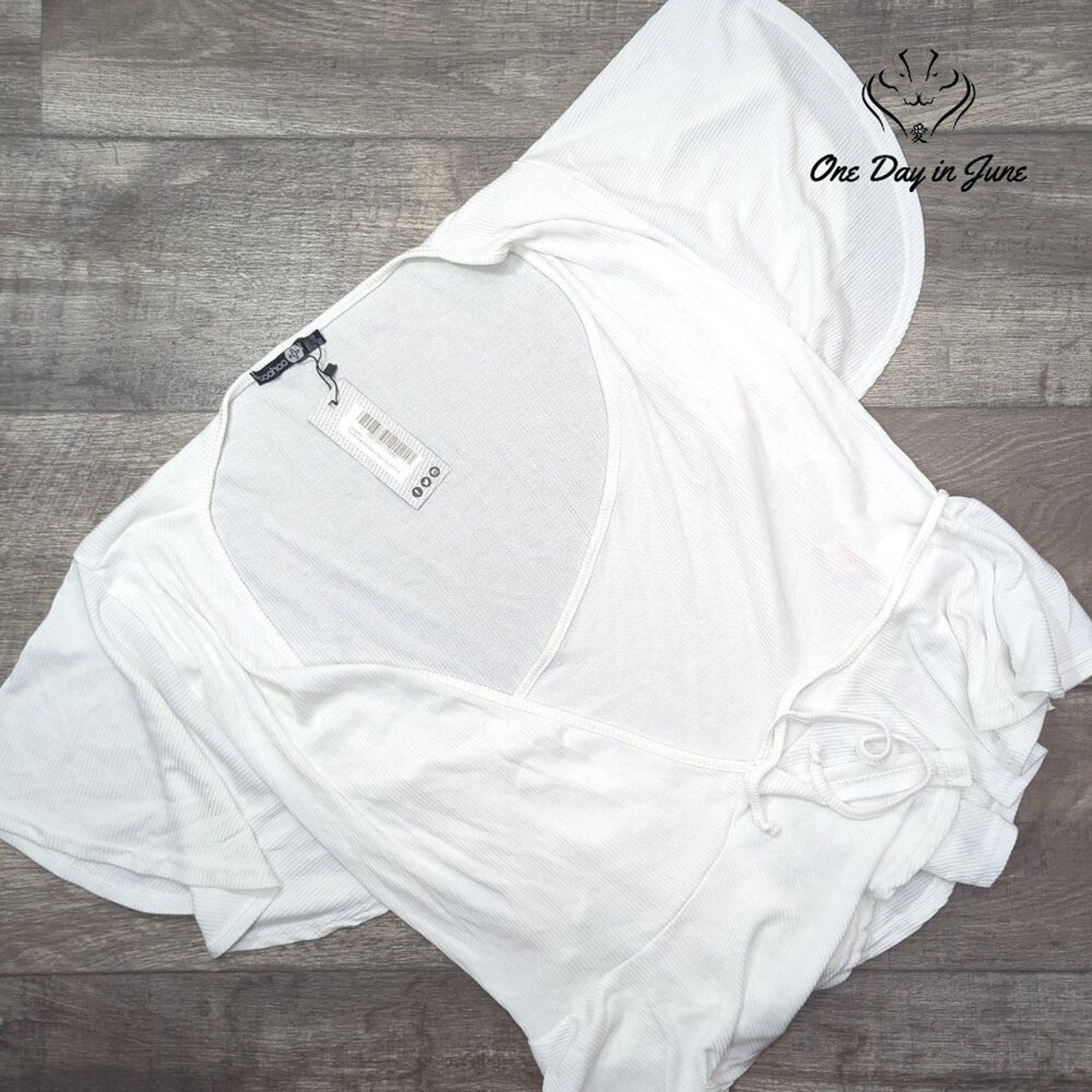 A delightful confection of a garment, this ribbed wrap top with its charming cap sleeves and flattering peplum silhouette is sure to enchant. In a pristine white hue, this Boohoo creation promises to be a becoming addition to any lady's wardrobe, lending an air of elegance to both daytime engagements and evening soirées.