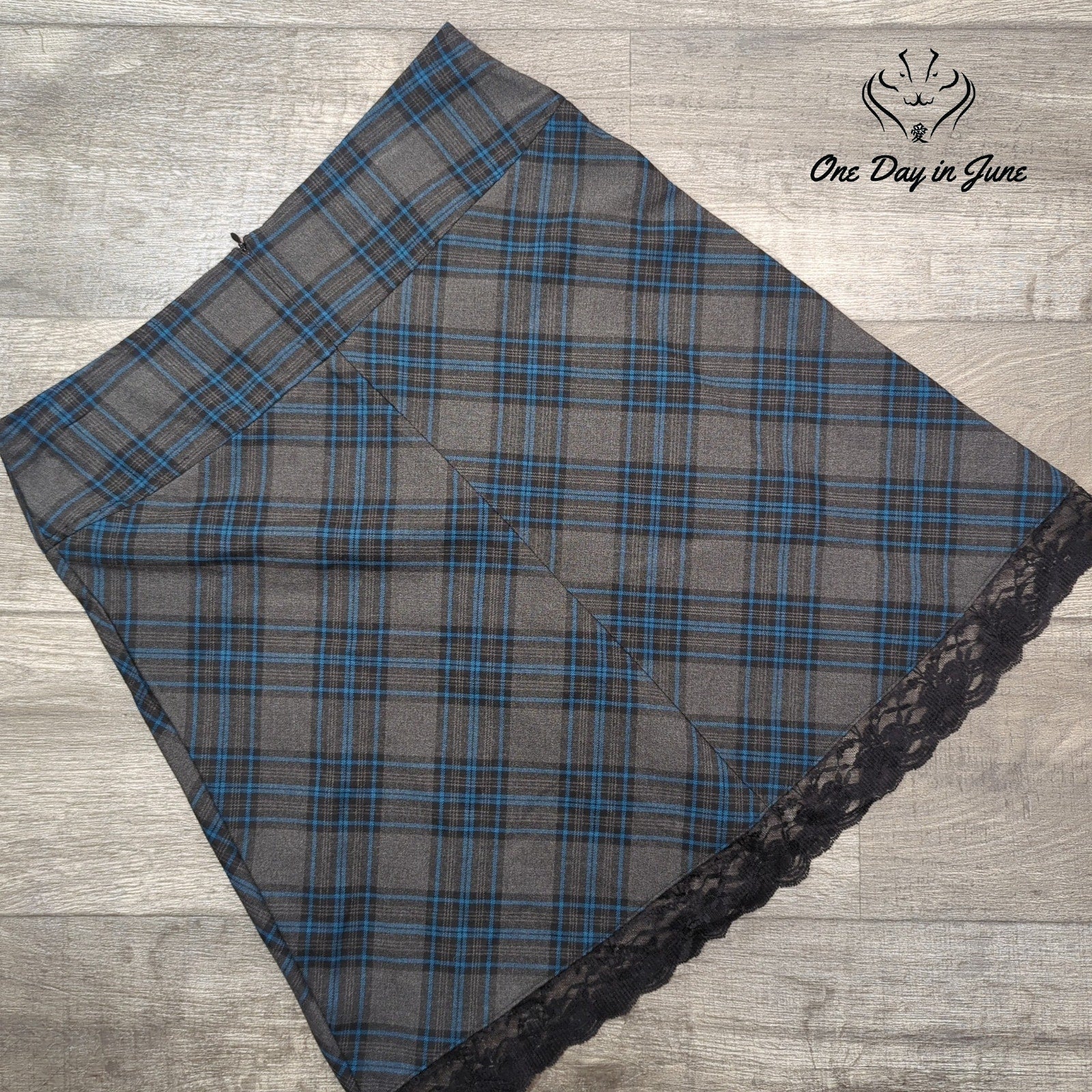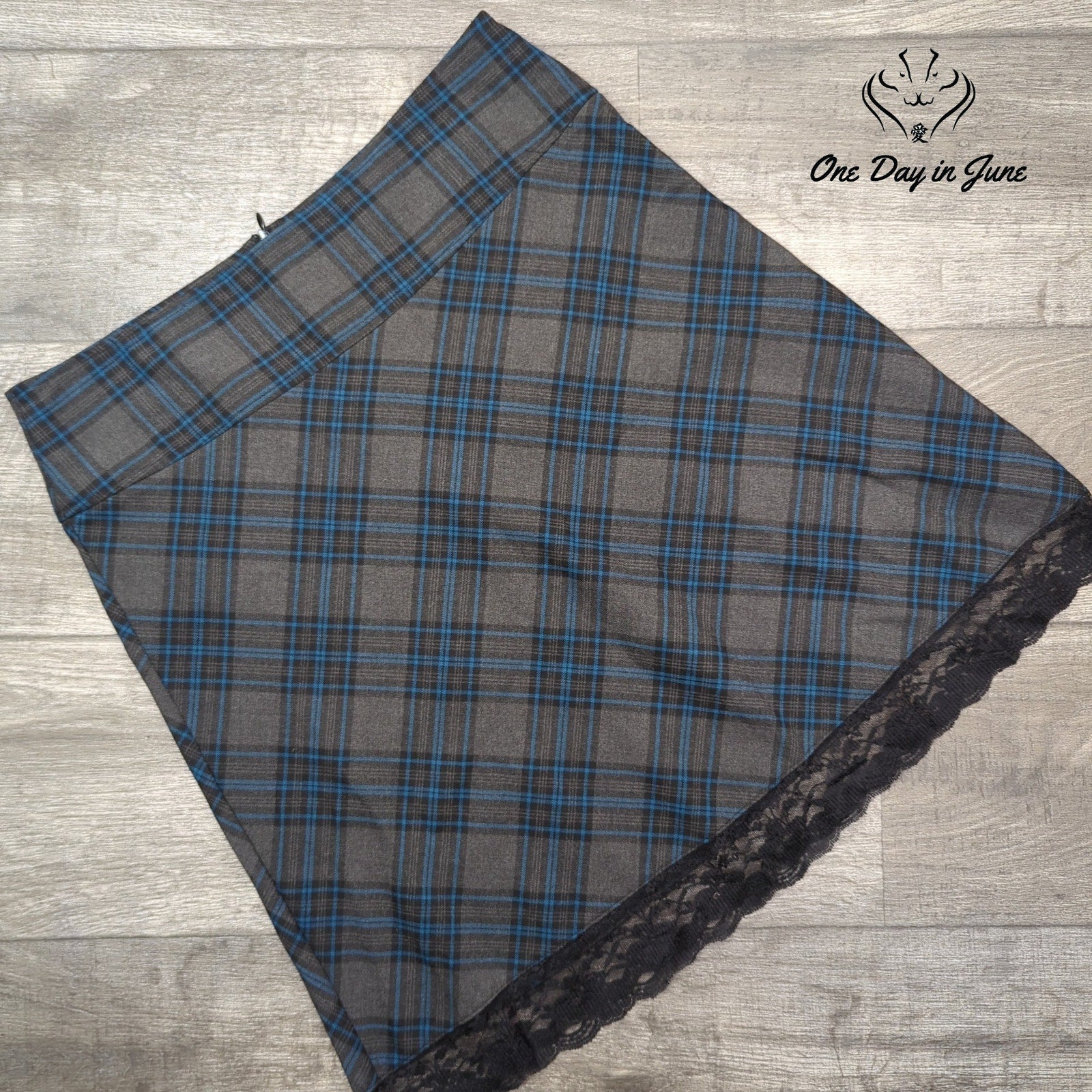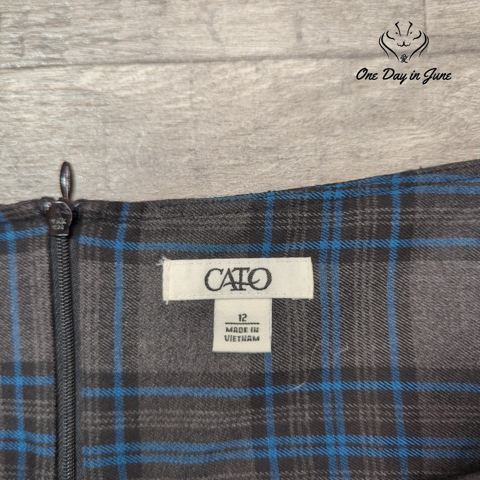 A delightful grey skirt from Cato, adorned with a charming lace edge that would surely catch the eye of any discerning lady. This exquisite piece, crafted from a blend of polyester, rayon, and spandex, boasts a condition that can only be described as nearly pristine, having scarcely been worn by its previous owner.