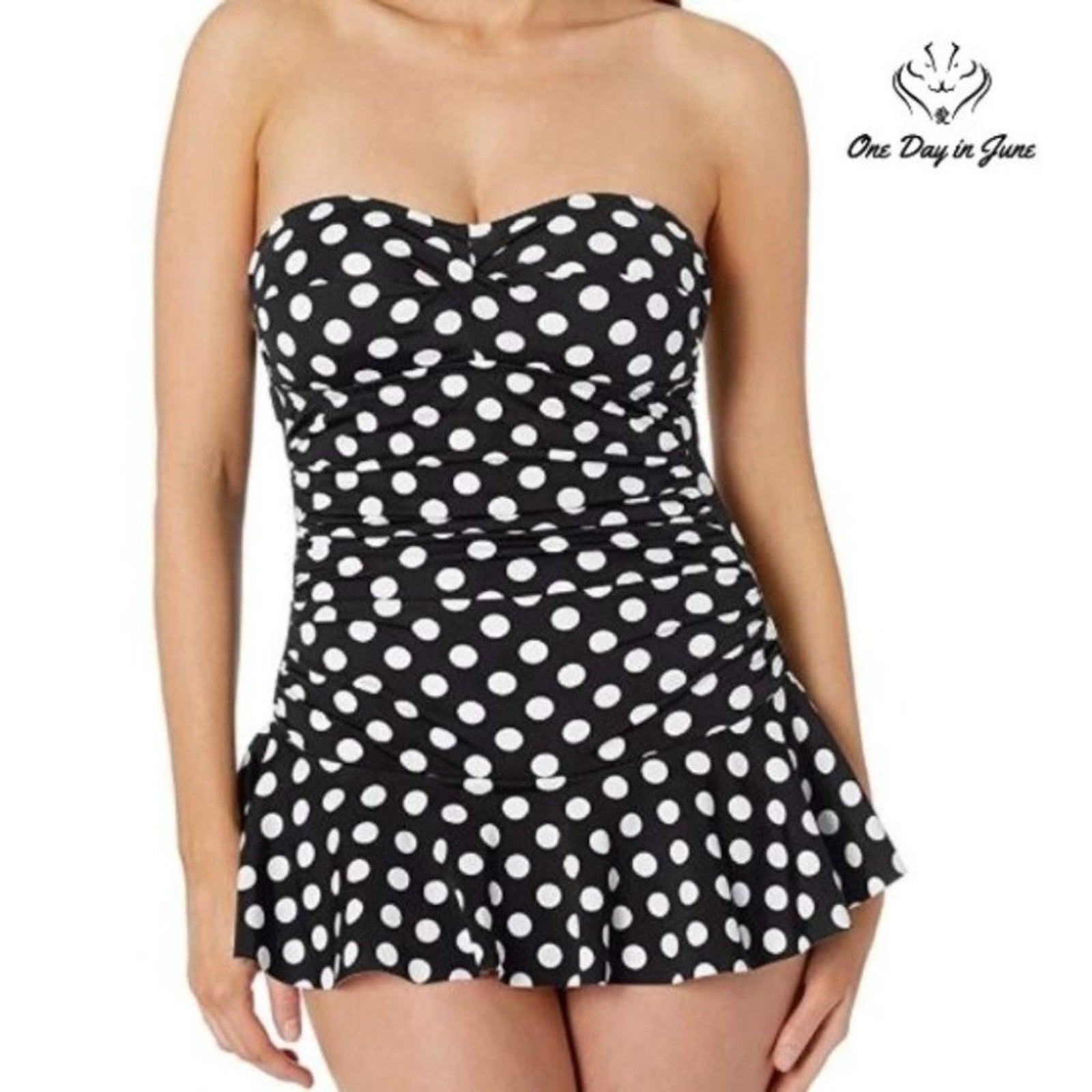 A flattering black bandeau swimsuit so sleek and so neat, with a fluttery skirt that makes swimming a treat! This Chaps beauty has built-in support and style galore, perfect for poolside or frolicking by the shore.