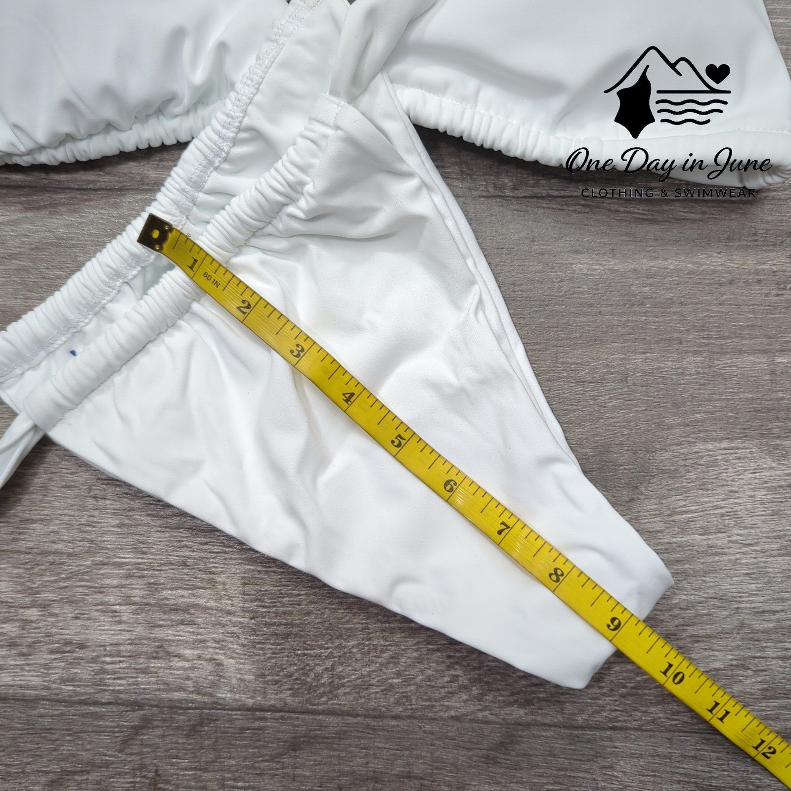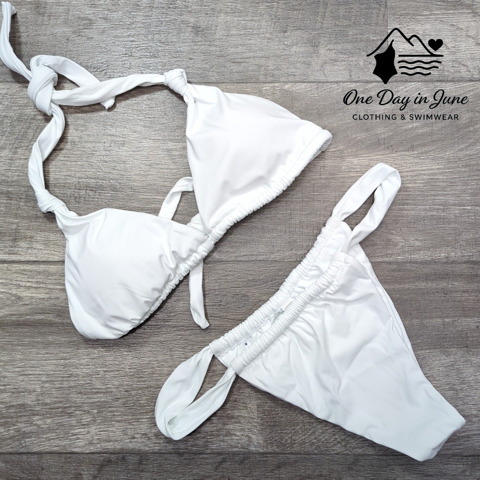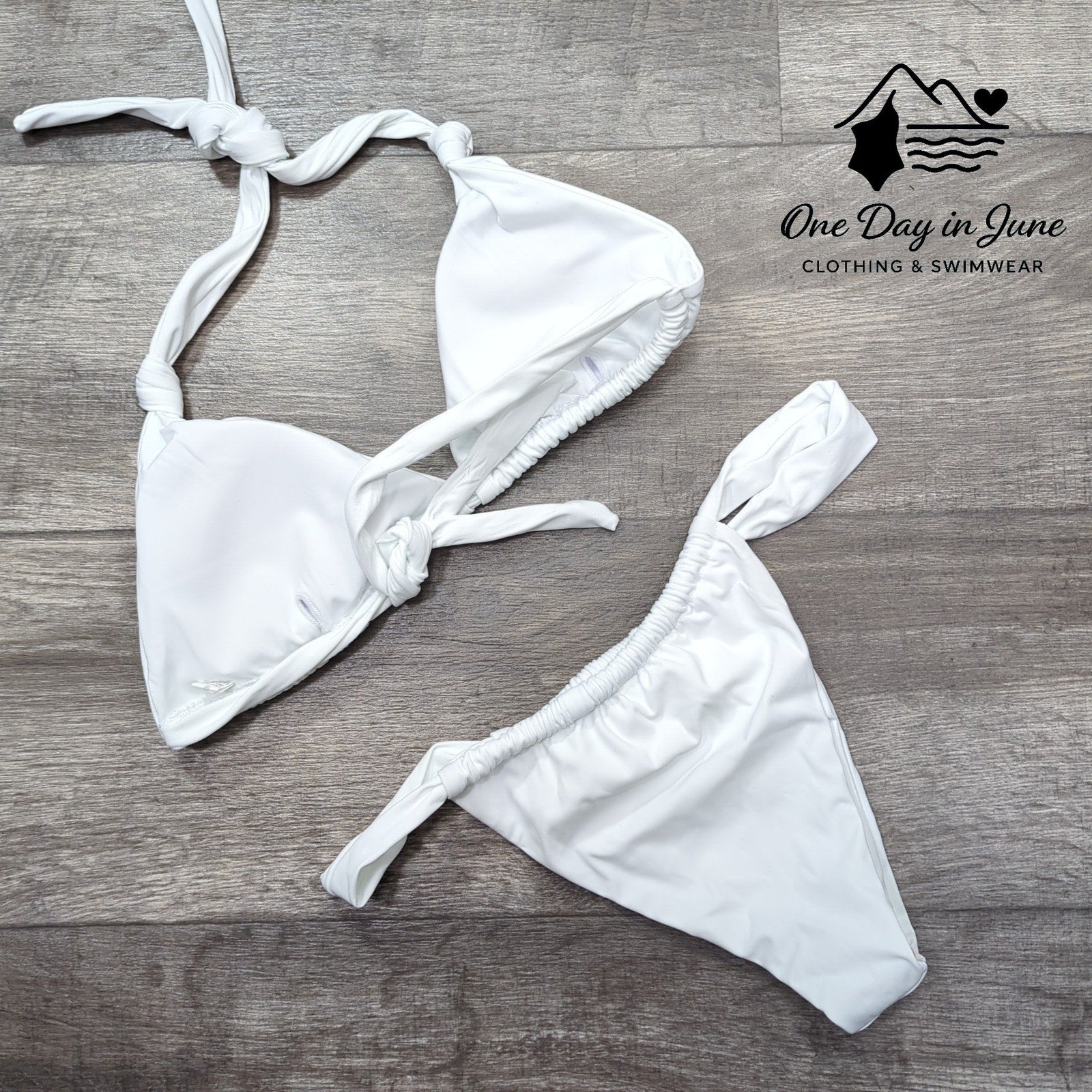 Luminous as a summer dream, this white Charmleaks halter bikini beckons with its Brazilian cut and graceful tie-back design. The polyester-spandex blend caresses the skin with a whisper of luxury, promising both comfort and elegance for those languid afternoons when the sun and water become one's only companions.