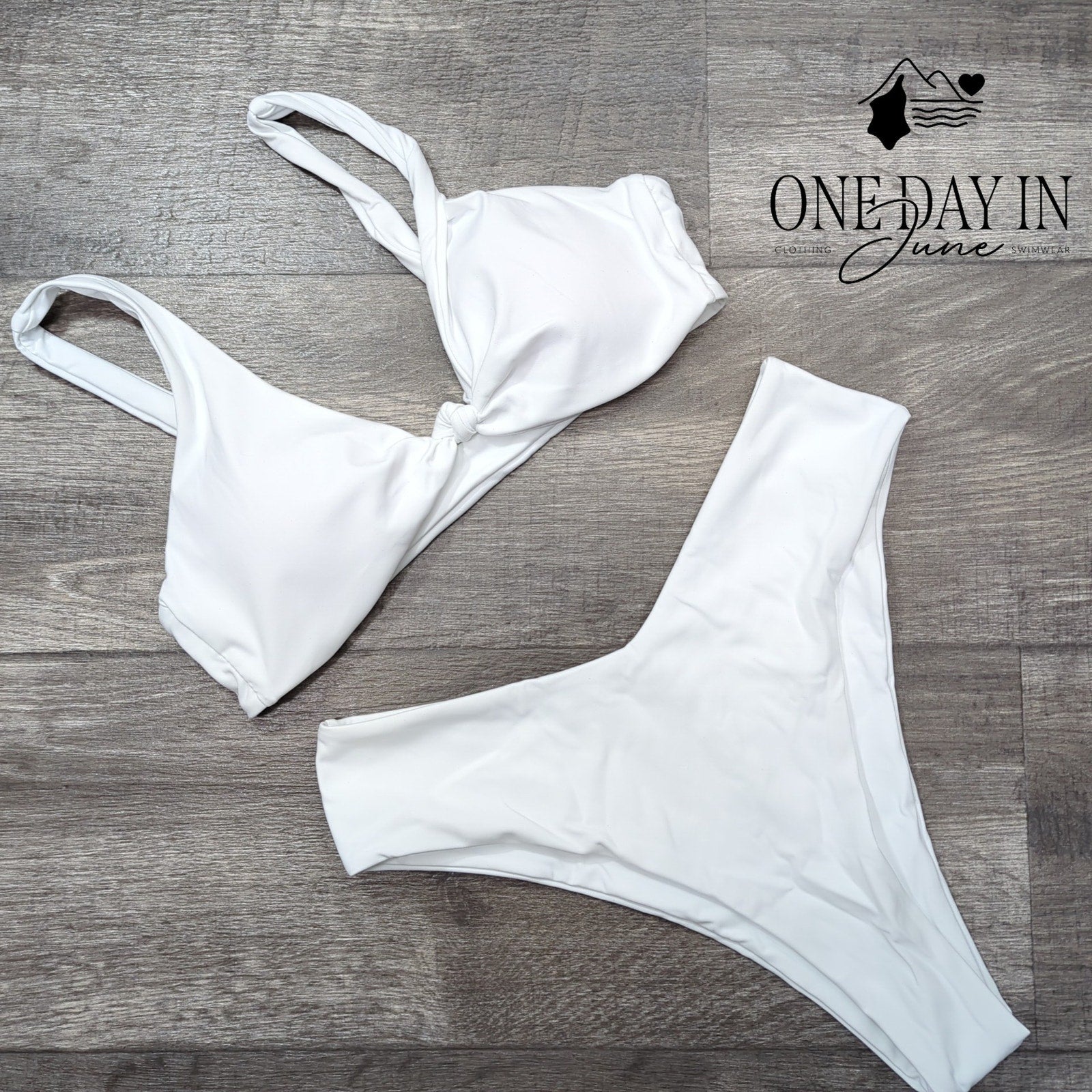 This pristine white bikini captures the essence of summer's most elegant moments, with a sophisticated knot detail that speaks to timeless feminine grace. Its high-cut silhouette flatters like moonlight on water, crafted from a luxurious blend of polyester and spandex that moves with the wearer's every gesture. A piece destined for poolside glamour and sun-drenched afternoons where style meets the eternal allure of seaside sophistication.