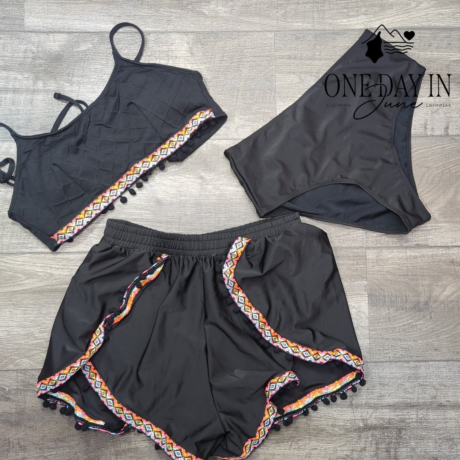 This enchanting three-piece ensemble captures the allure of midnight waters with its obsidian hue and delicate lace-up details that whisper of summer romance. Crafted from a luxurious blend of polyester and spandex, each piece promises both comfort and that coveted silhouette of the modern Venus. A cropped design adds contemporary sophistication to this timeless tribute to feminine grace.